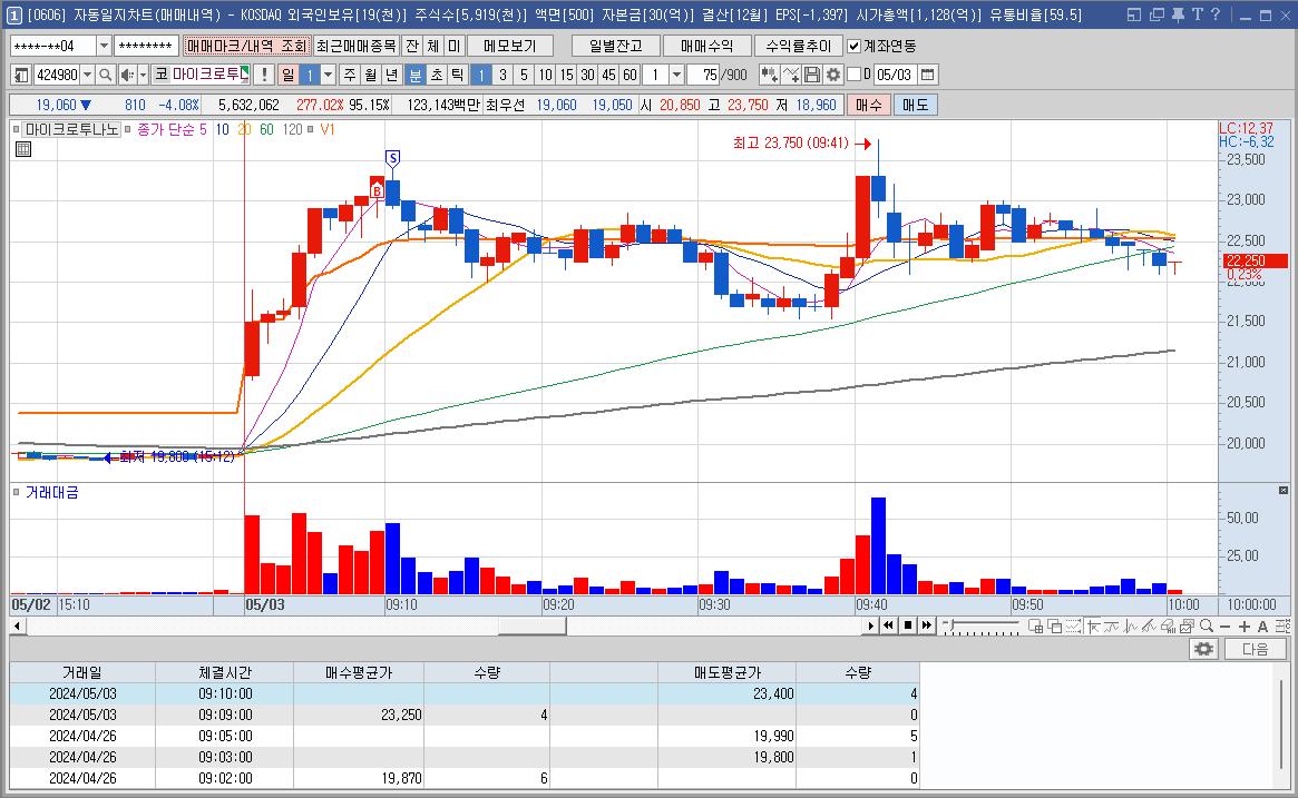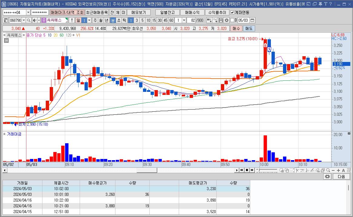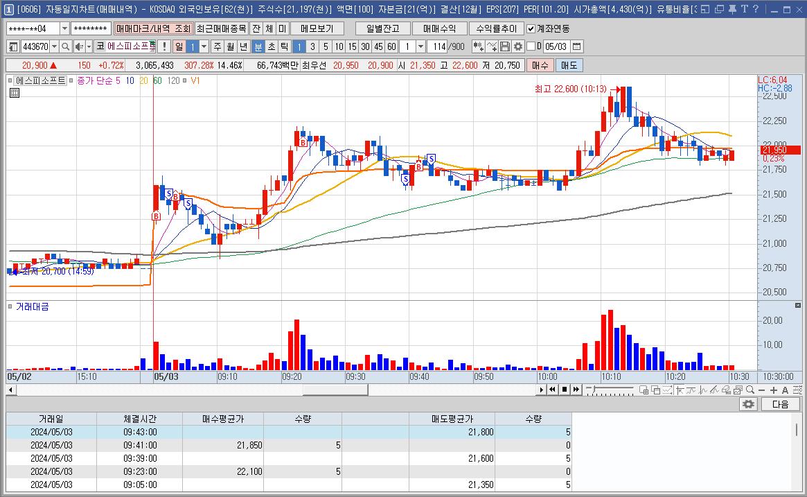 그래서 매수세가 들어오는 걸 보고 에스피소프트를 골라 매매를 했는데 생각과 다르게 움직여서