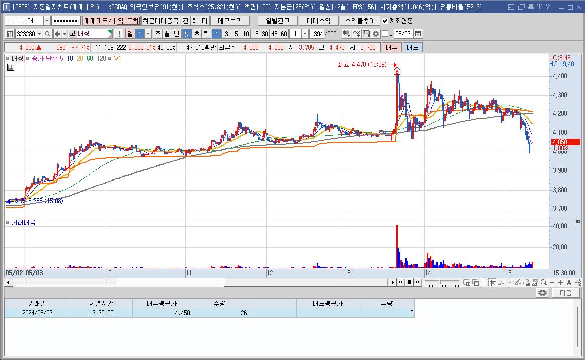 기관, 외인 양매수로 많이 사길래 종가매수를 생각했는데 태성에 물리면서 하지 못했다