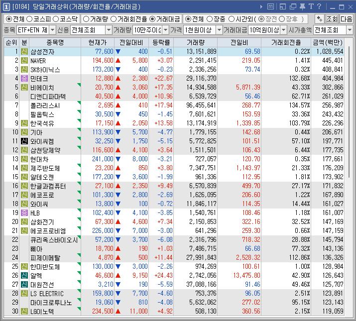 종목명 | 등락률 | 거래대금(백만) | 이유 |