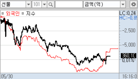 장 초반 9시 40분정도까지 외국인이 선물을 4천억 넘게 팔고 있었다