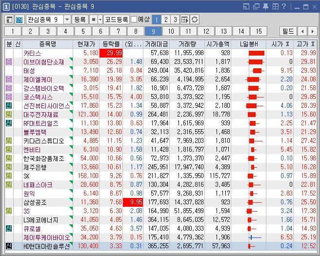 삐아 | 7.72 | 6,559 | 최근 중국 경기 회복과 한중 정상회담 진행으로 한중 교류 회복 기대감 속 중국소비주/화장품 테마 상승 화장품 해외 수출증가 추세 지속 리레이팅 기대감 속 화장품 테마 강세 |