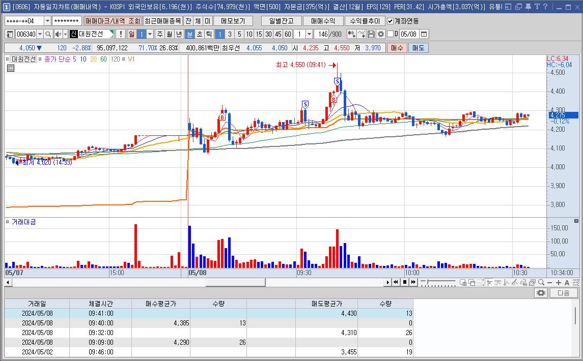 종가베팅한 종목들을 매도하고 전력주들이 강세기에 대원전선을 골랐는데 다른 종목들은 잘 가는데