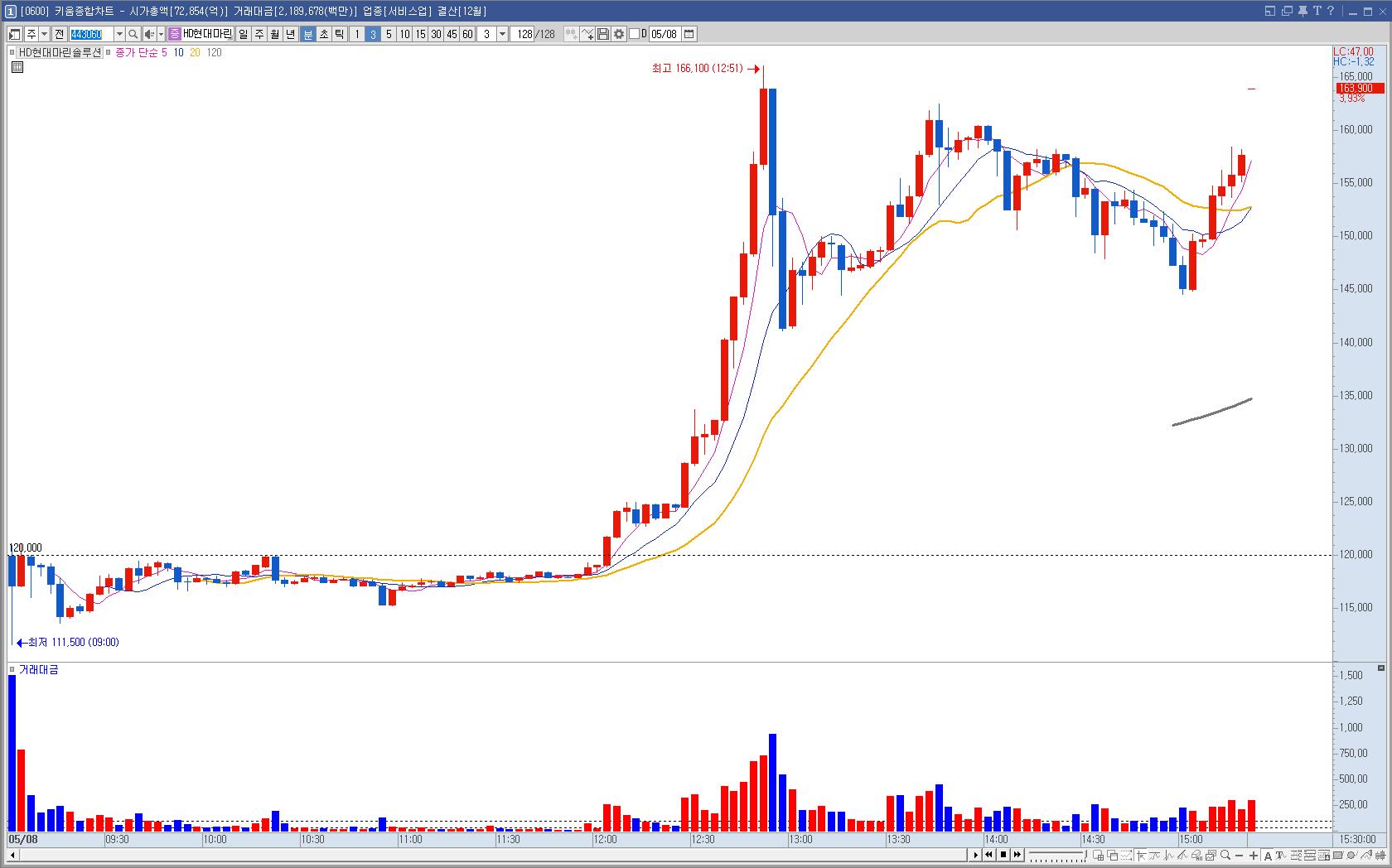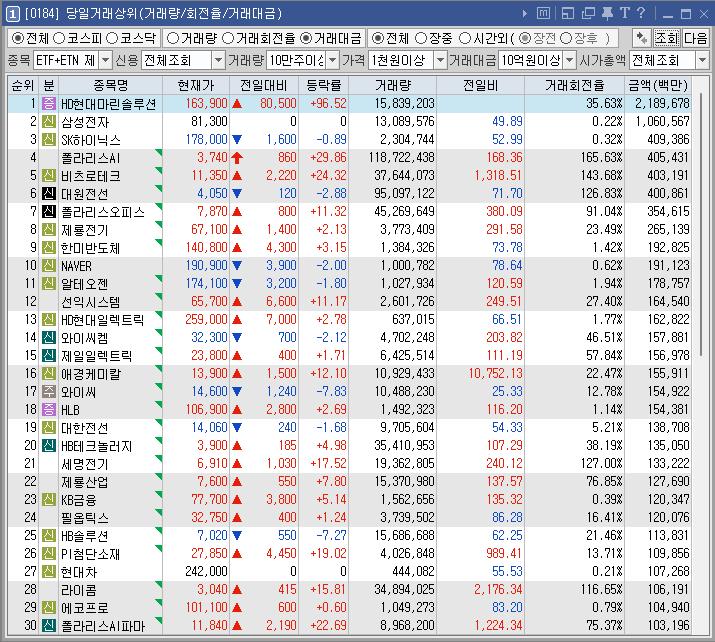 HD현대마린솔루션 | 96.52 | 2,155,470 | 코스피 신규 상장 첫날 강세. [기관이 매수] |