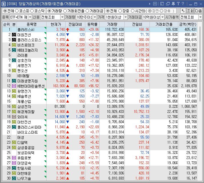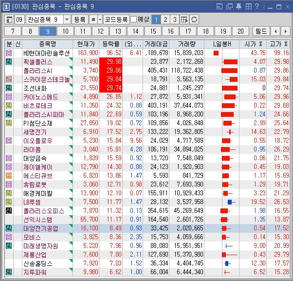 대양전기공업 | 8.49 | 33,167 | AI 투자 증가로 전력수요 증가 기대감 속 전력설비 테마 강세 지속 |