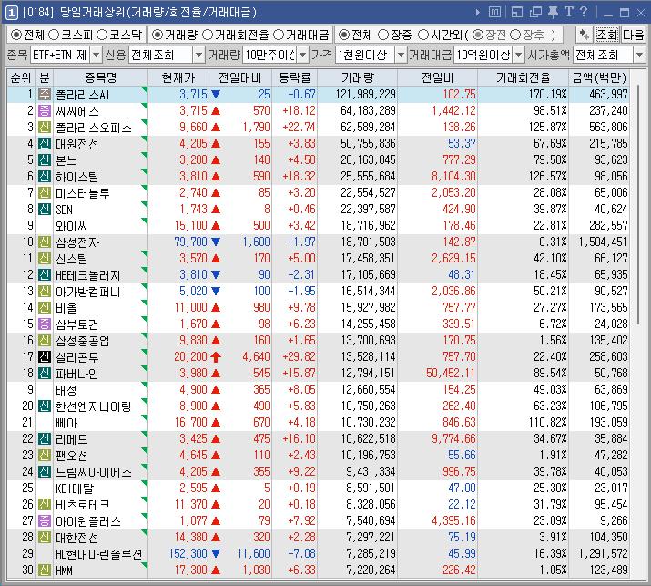 시장의 거래대금을 많이 가져가서인지 시장이 혼조세라서 그런지 거래대금이 늘어났어도