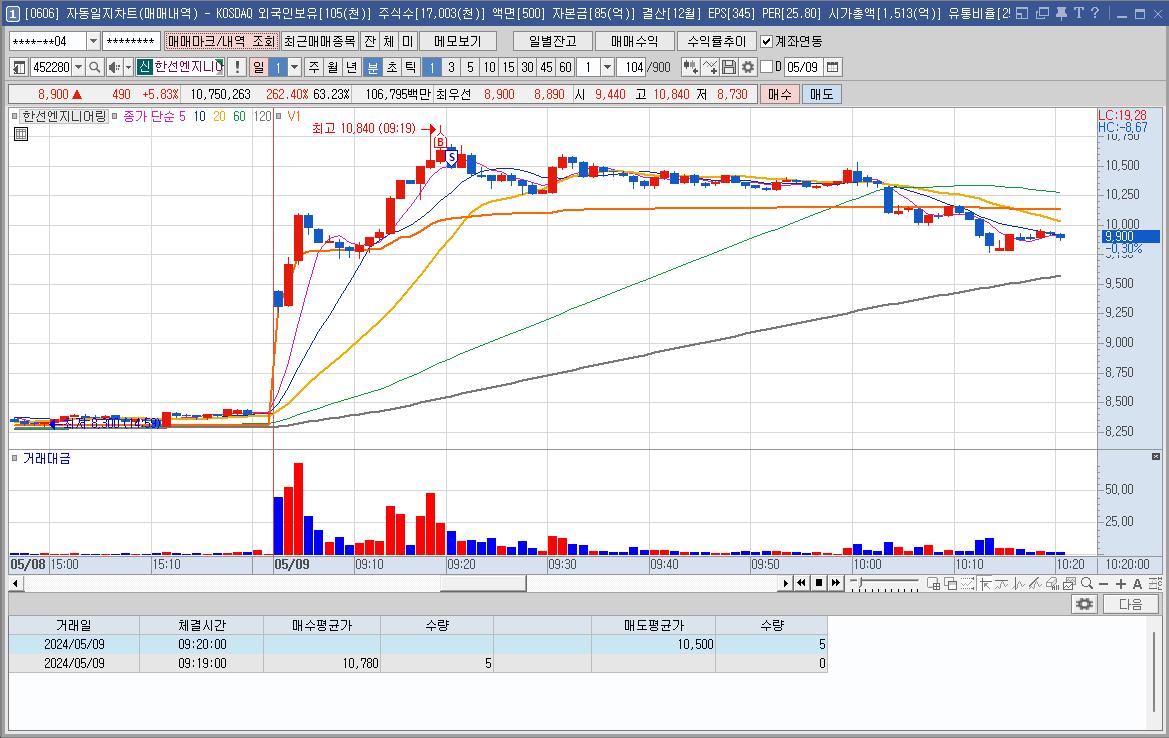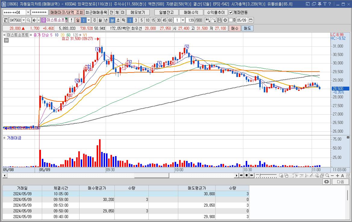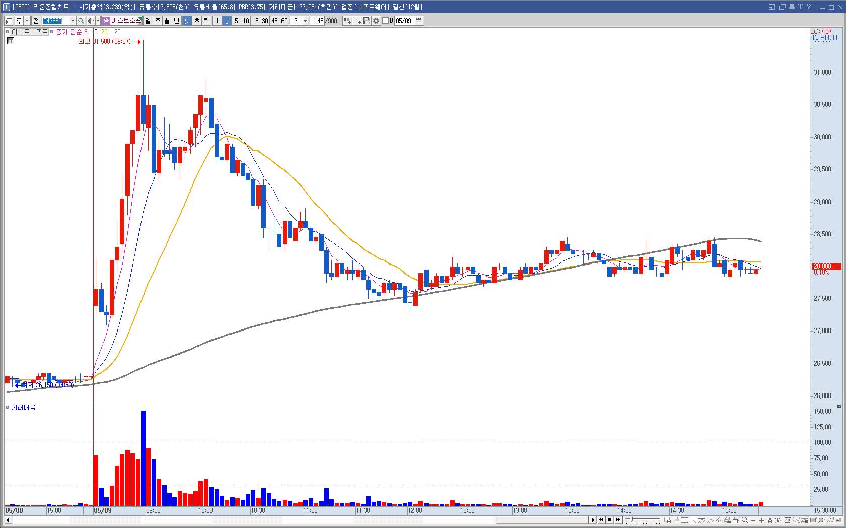 강하게 오르고 있었고 이 정도면 상한가까지 가겠다는 생각에 매수를 했으나 하락하는 모습에 손절