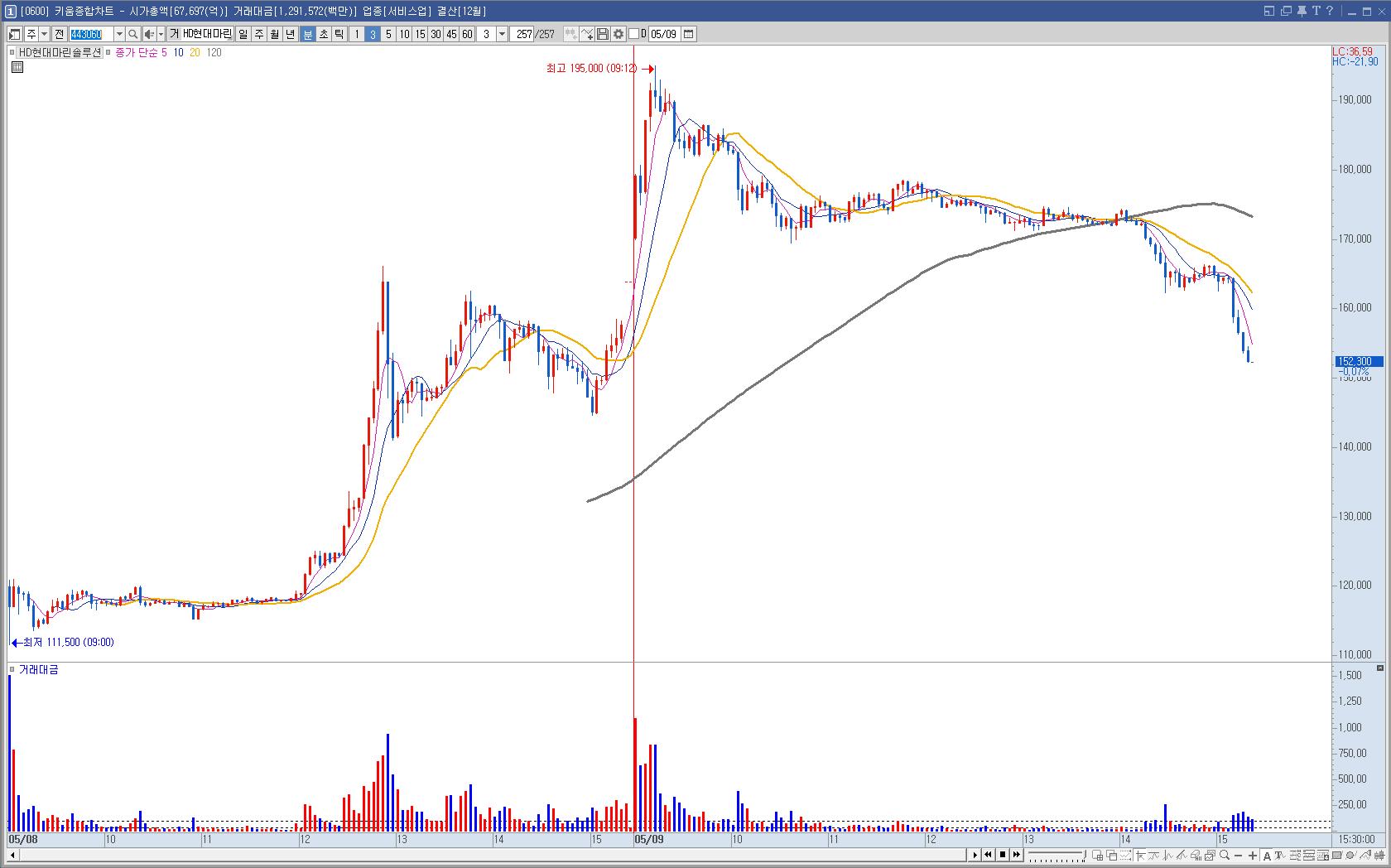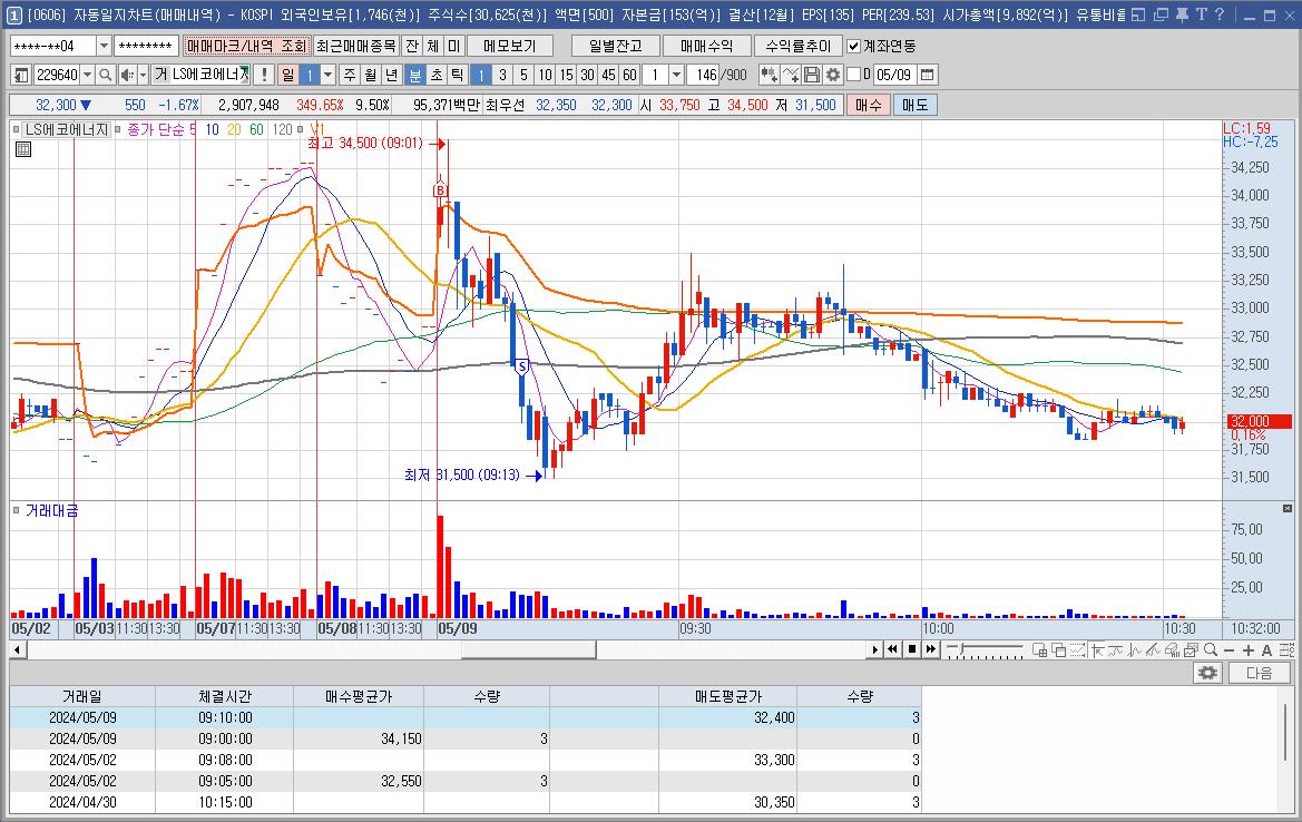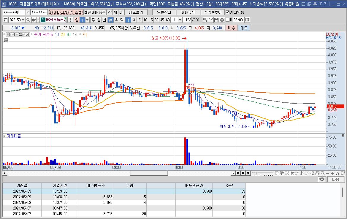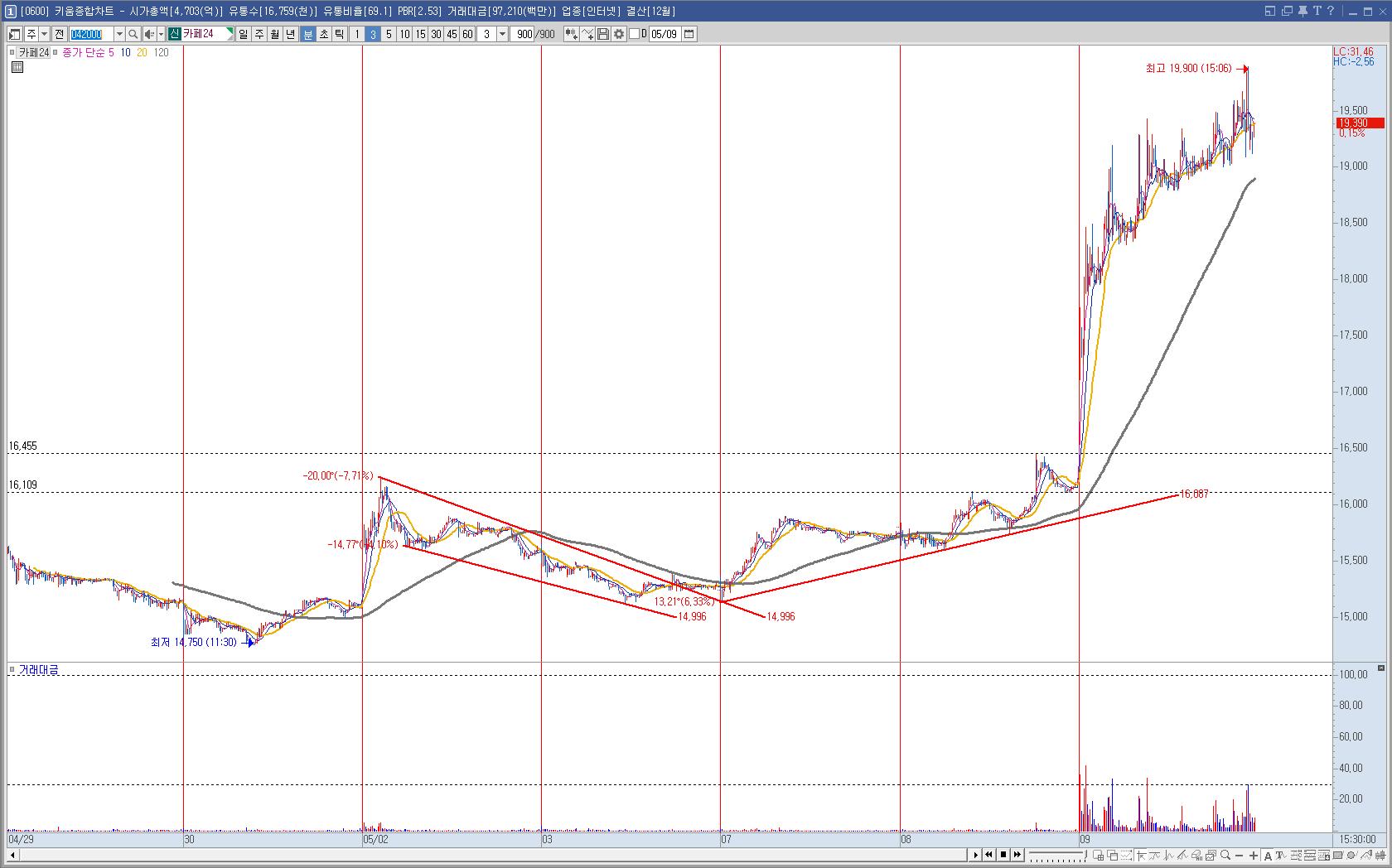강하게 오르고 있었고 이 정도면 상한가까지 가겠다는 생각에 매수를 했으나 하락하는 모습에 손절