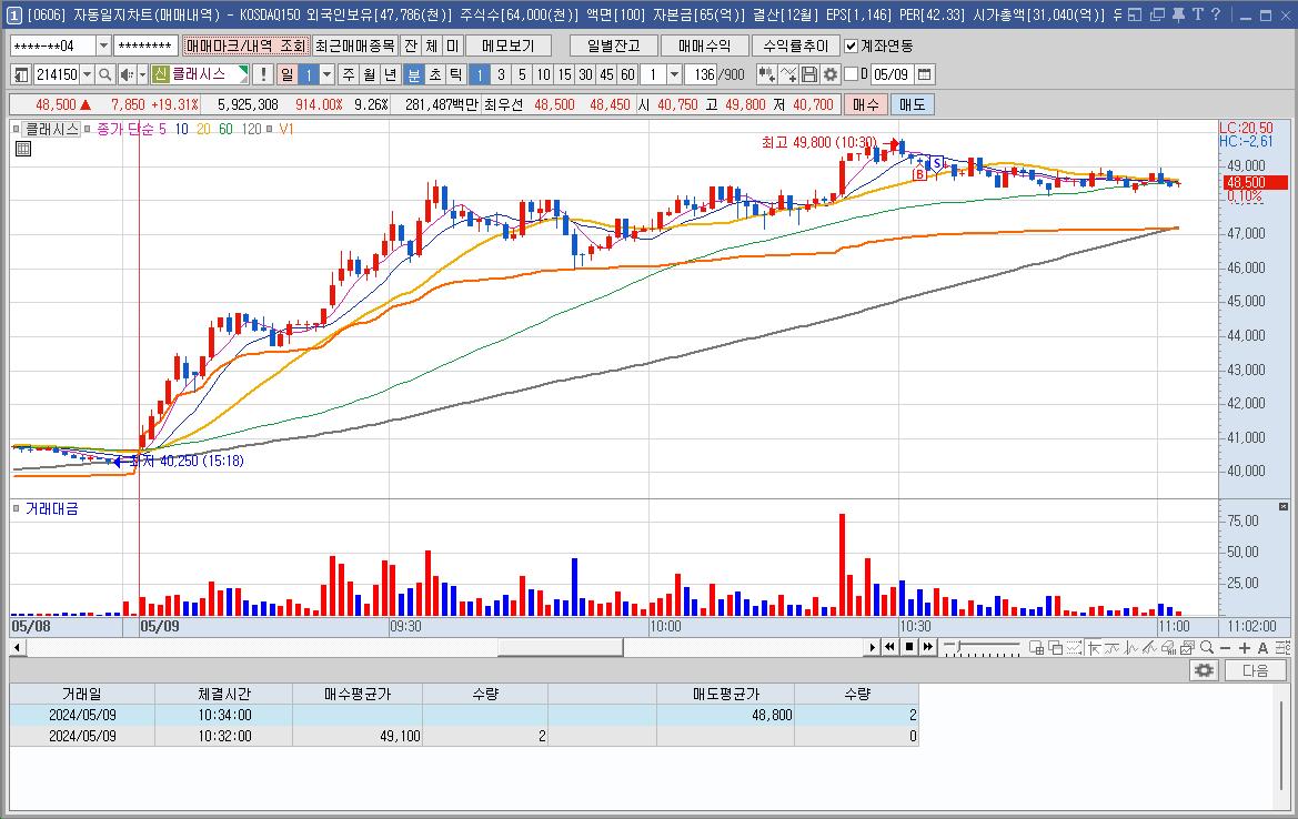 재료가 좋아서 보고 있던 종목인데 다른 매매 하다가 발견시 돌파가 나온 뒤라서 매매를 안하려고 했는데