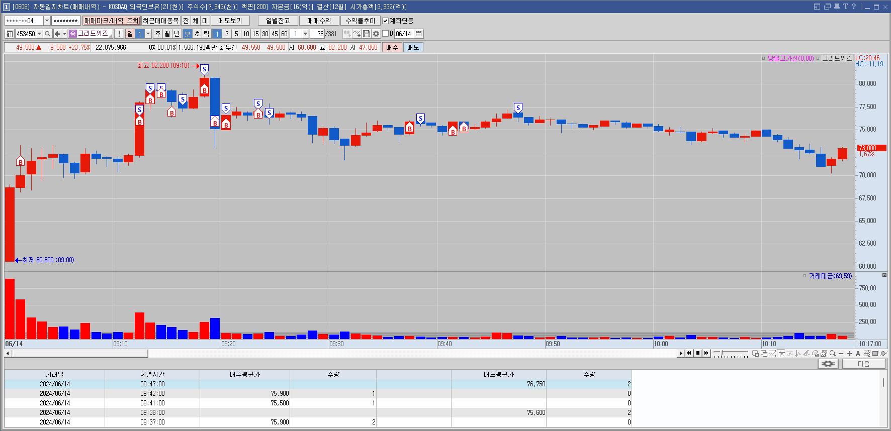 매수세가 강한 모습에 매수하고 지지 되는 모습에 반복 매매를 했는데
