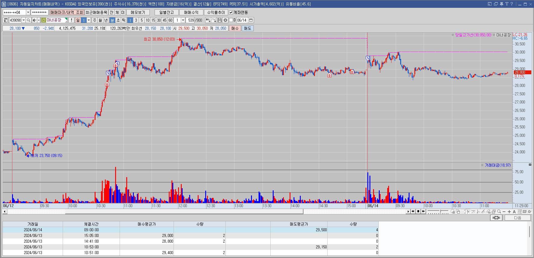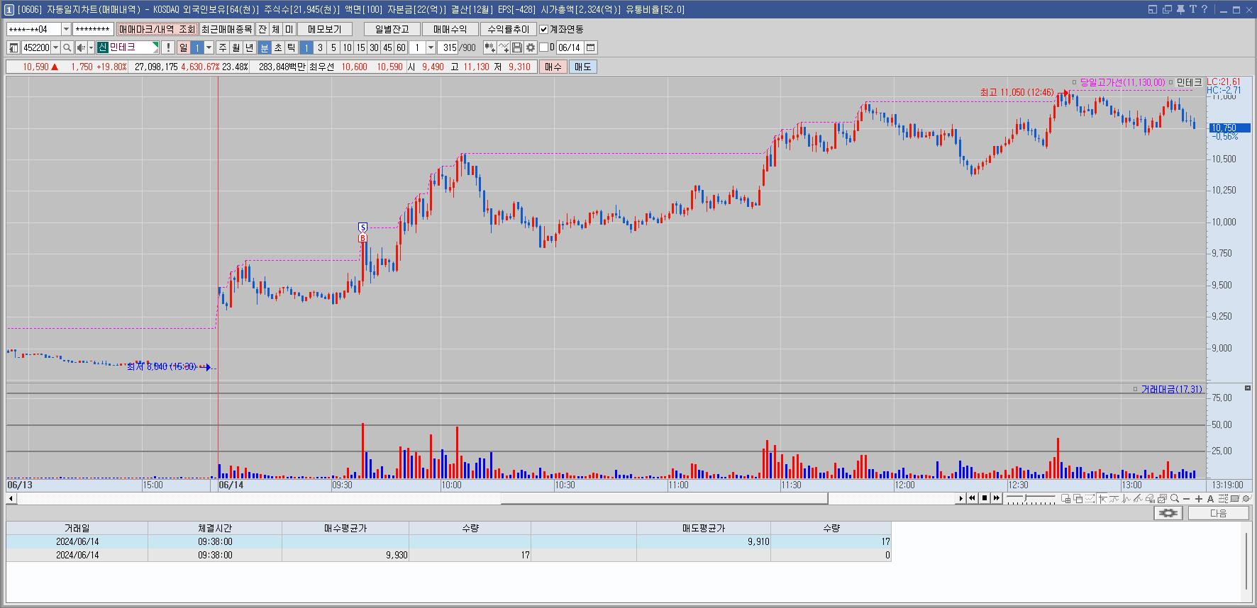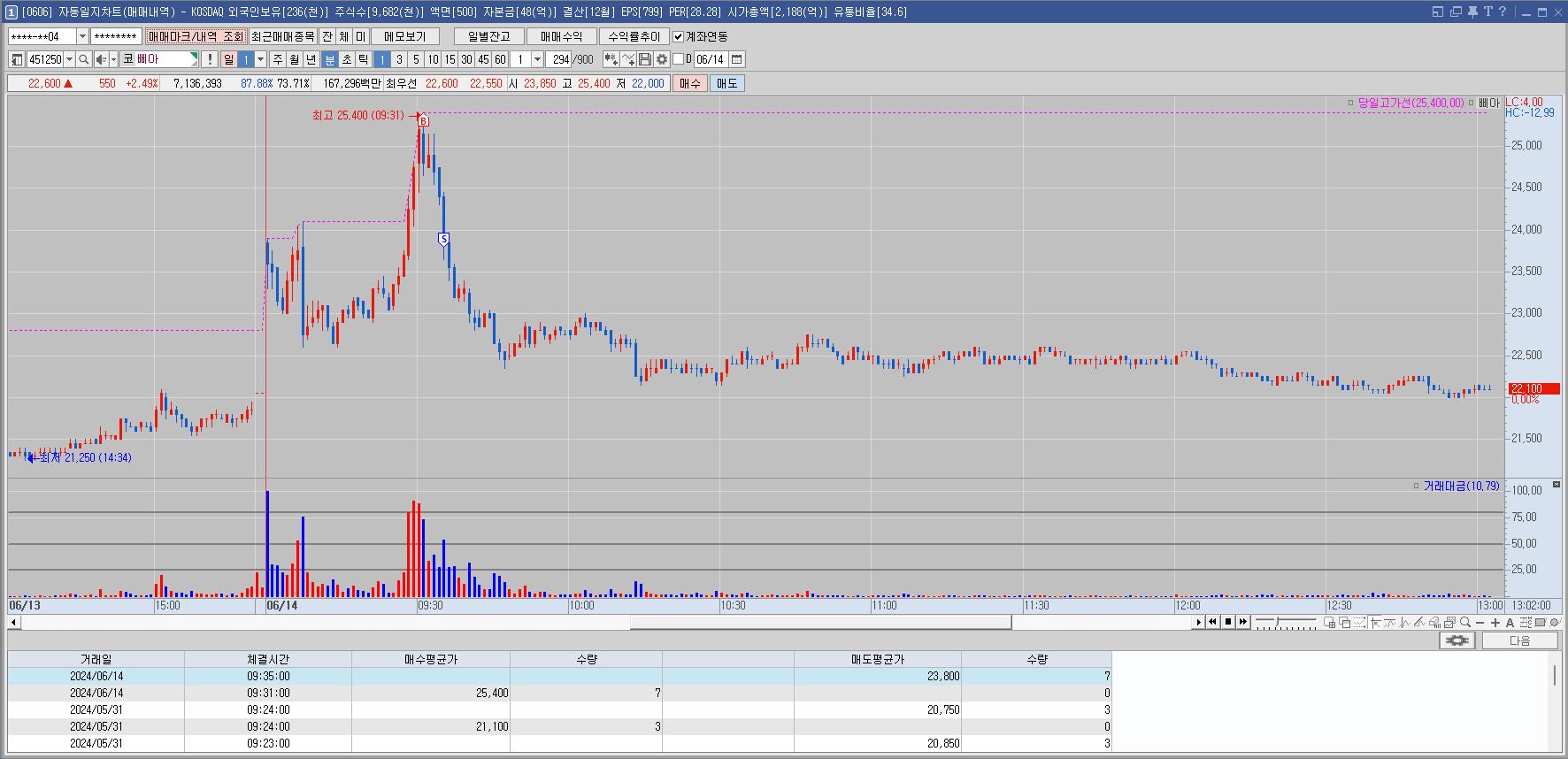 시초가에 들어갈까 고민중이었는데 전일종가 매수한 것이 바로 안팔려서 조금 늦게 보니 이미 확 올라있었다