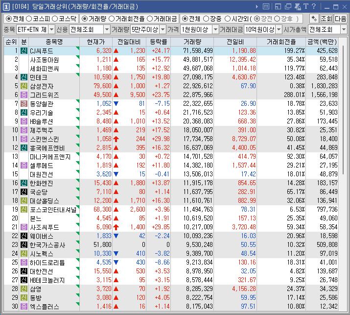 CJ씨푸드 | 24.17 | 422,609 | 글로벌 K푸드 열풍 지속 부각 식음료 테마 강세 |