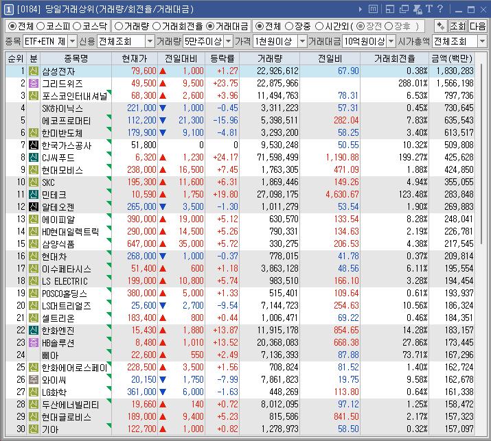 그리드위즈 | -6.57 | 14,564 | 투자주의]단일계좌 거래량 상위종목 |