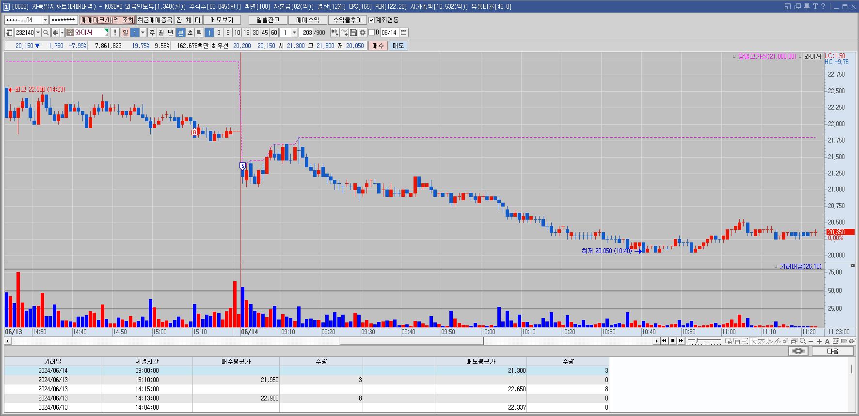 전일 장후반에 매수해서 홀딩. 갭상승 수익으로 와이씨의 손실을 메꿈