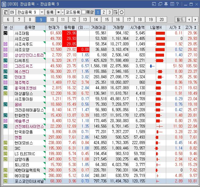 대상홀딩스 | 16.30 | 127,651 | 글로벌 K푸드 열풍 지속 부각 식음료 테마 강세 |