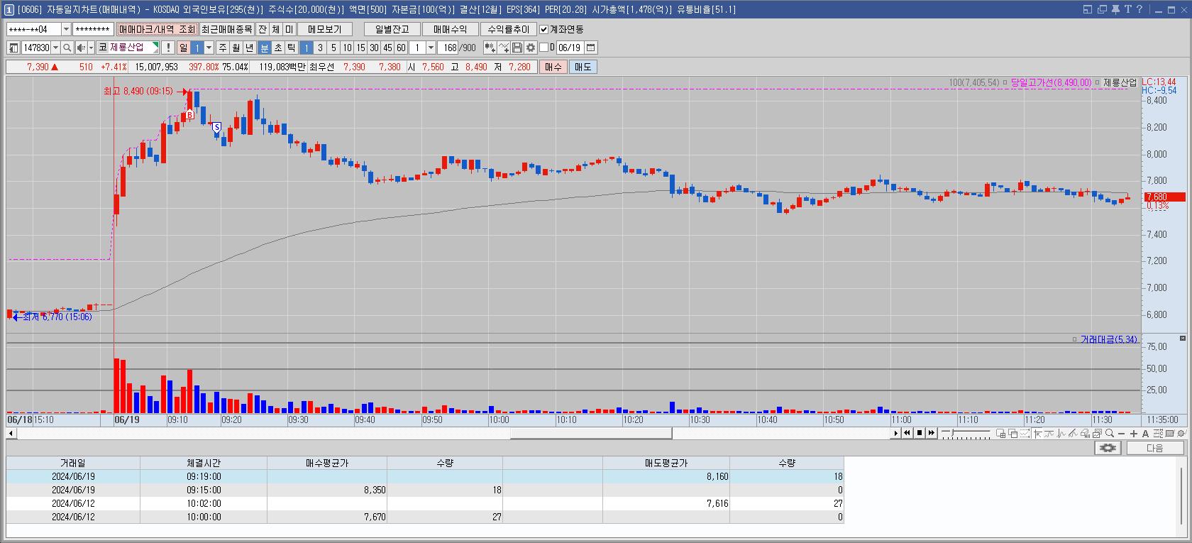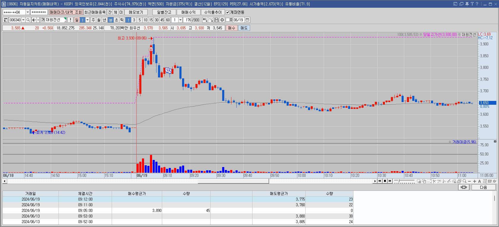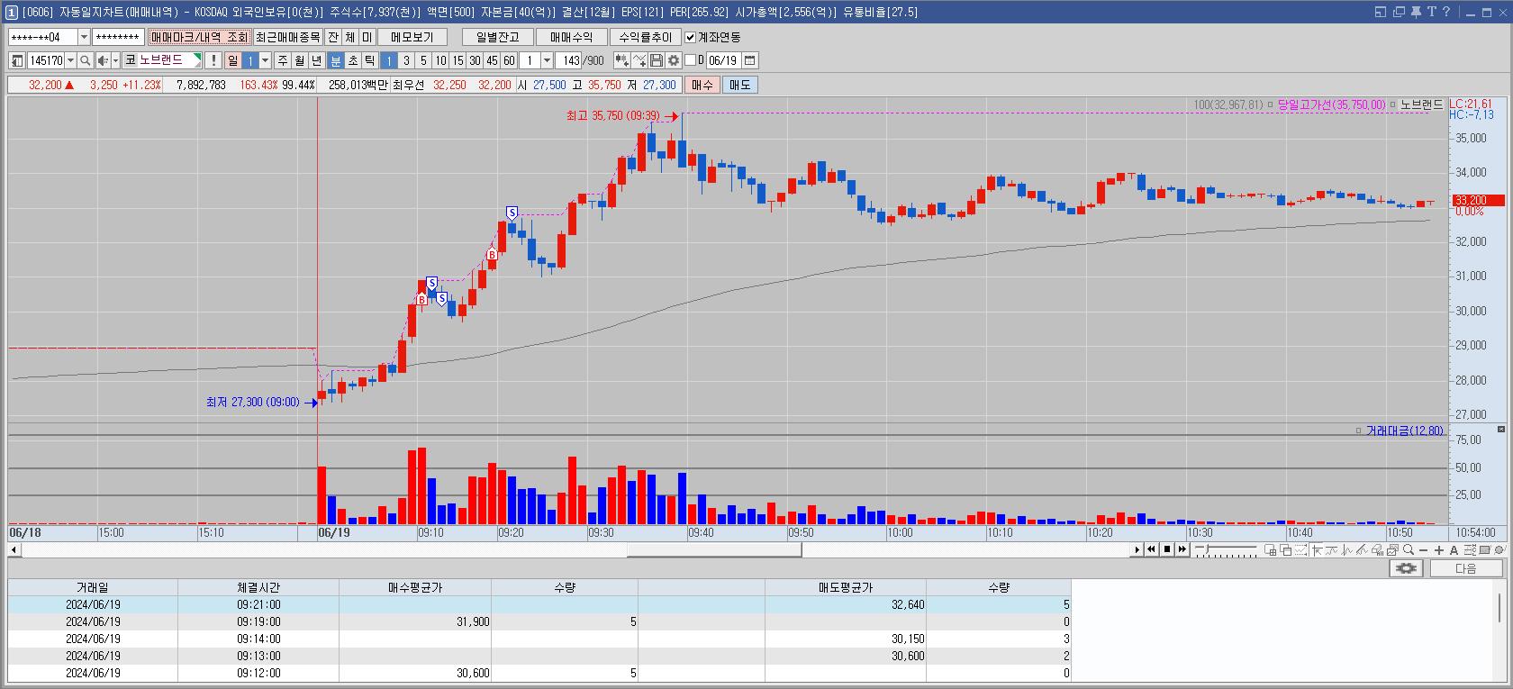 오늘도 병원에 가느라 초반에만 매매하고 매매를 더 못했는데 이 후 신규주 하나가 꽤 큰 변동성을 보여줬다