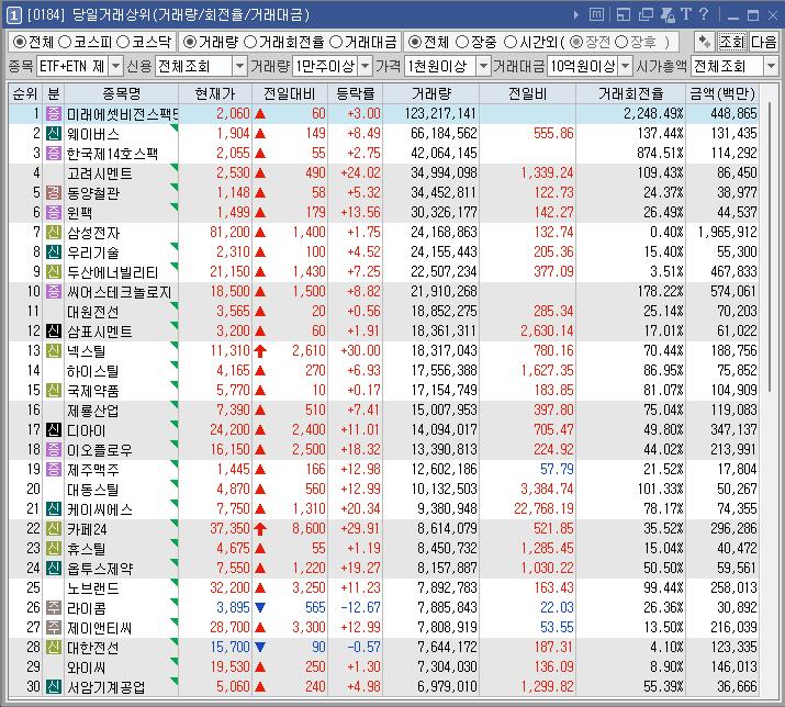 웨이버스 | -3.36 | 2,569 | 단기과열종목(3거래일 단일가매매) 지정 |