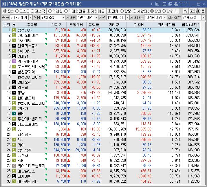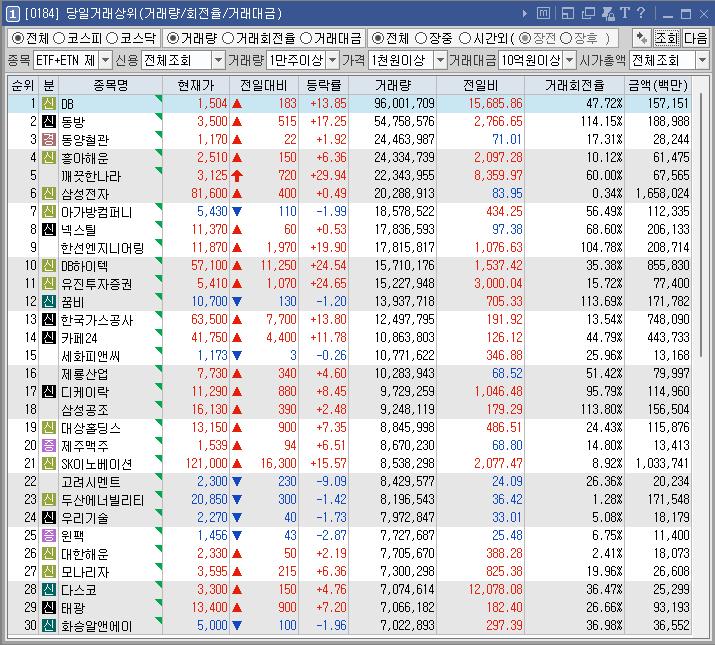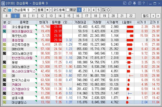 깨끗한나라 | 29.94 | 67,532 | 윤 대통령 “인구 국가 비상사태 선언…저출산 총력 대응 체계 가동” 소식 속 출산장려 테마 상승 한동훈, 23일 당대표 출마 선언 기대감 속 한동훈 테마 상승 |