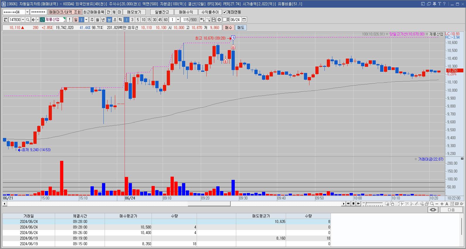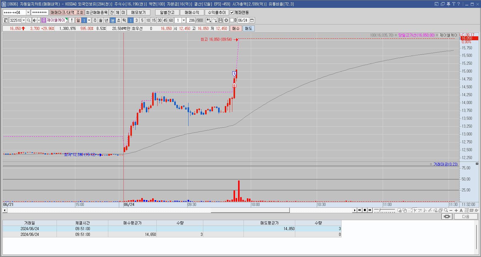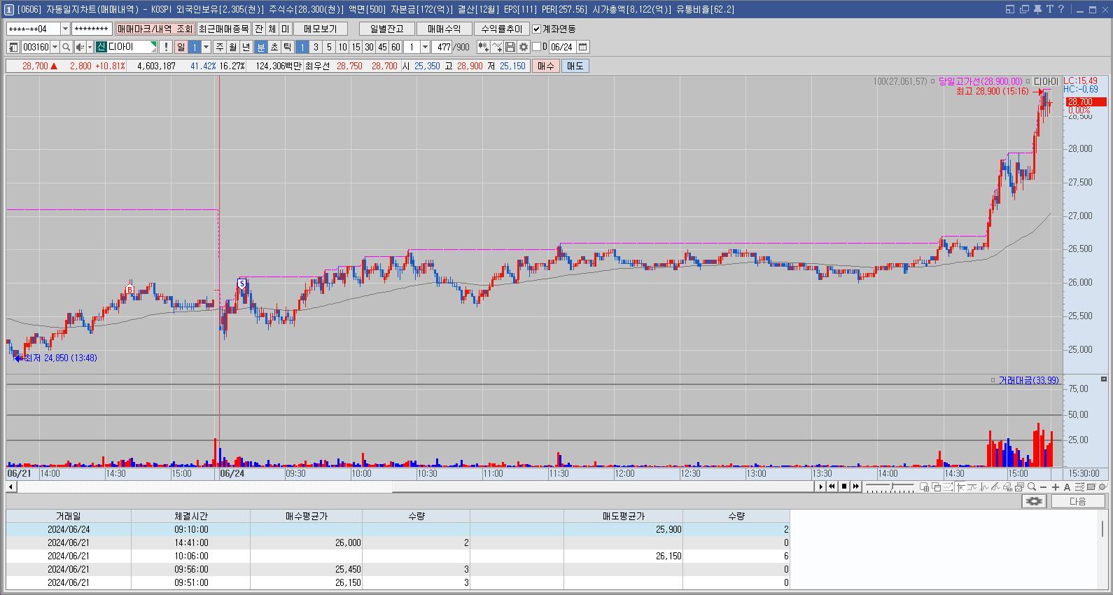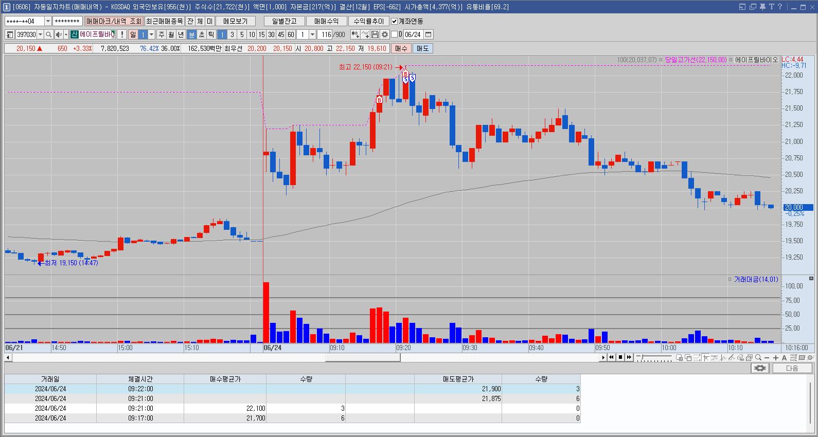 전일 강했던 종목. 상승 시도를 지속하는 모습에 진입. 멈춤에 매도하고 지켜보다가 하락하는 모습에 종료
