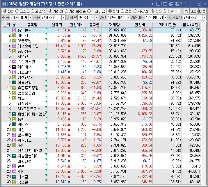 STX그린로지스 | 23.84 | 164,122 | 홍해사태 장기화로 해상운임 강세 소식 속 해운/물류 테마 강세 |