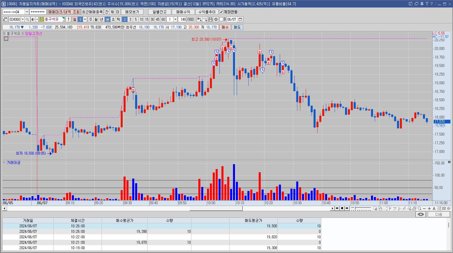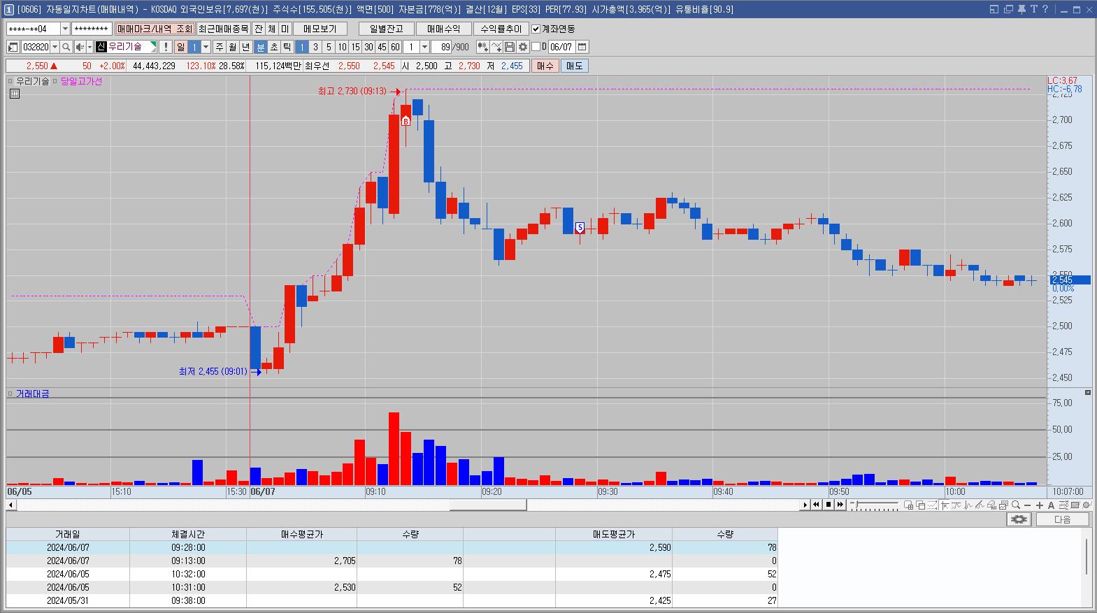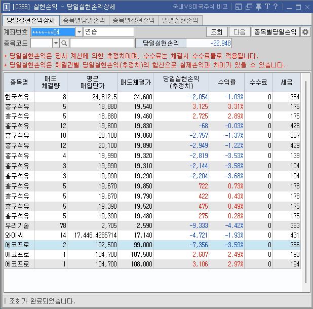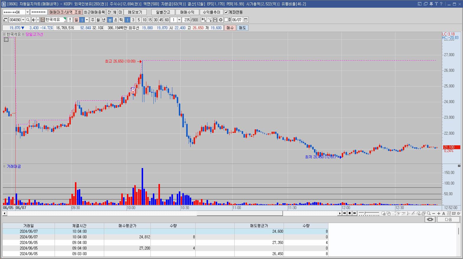 장 초반에 에코프로머티로 손실이 발생한 상태에서 흥구석유를 매수했다가 급락에 물려있는 시간을 보내면서