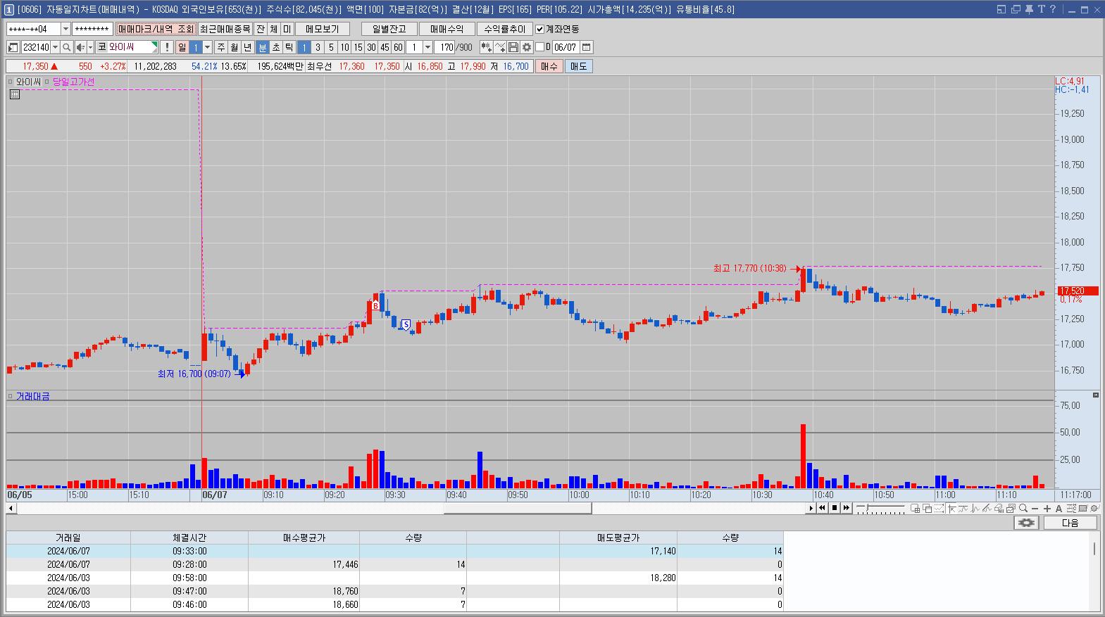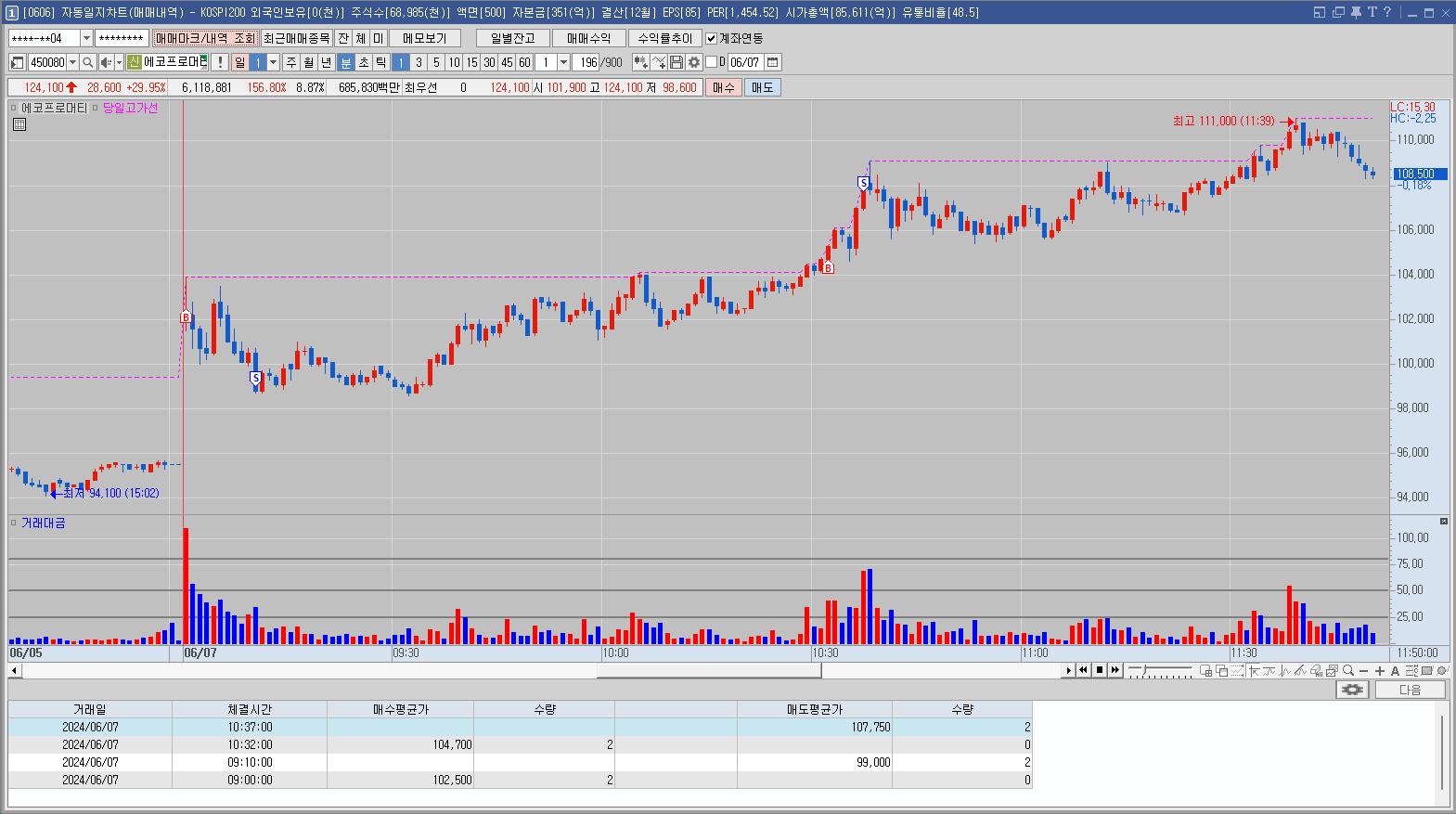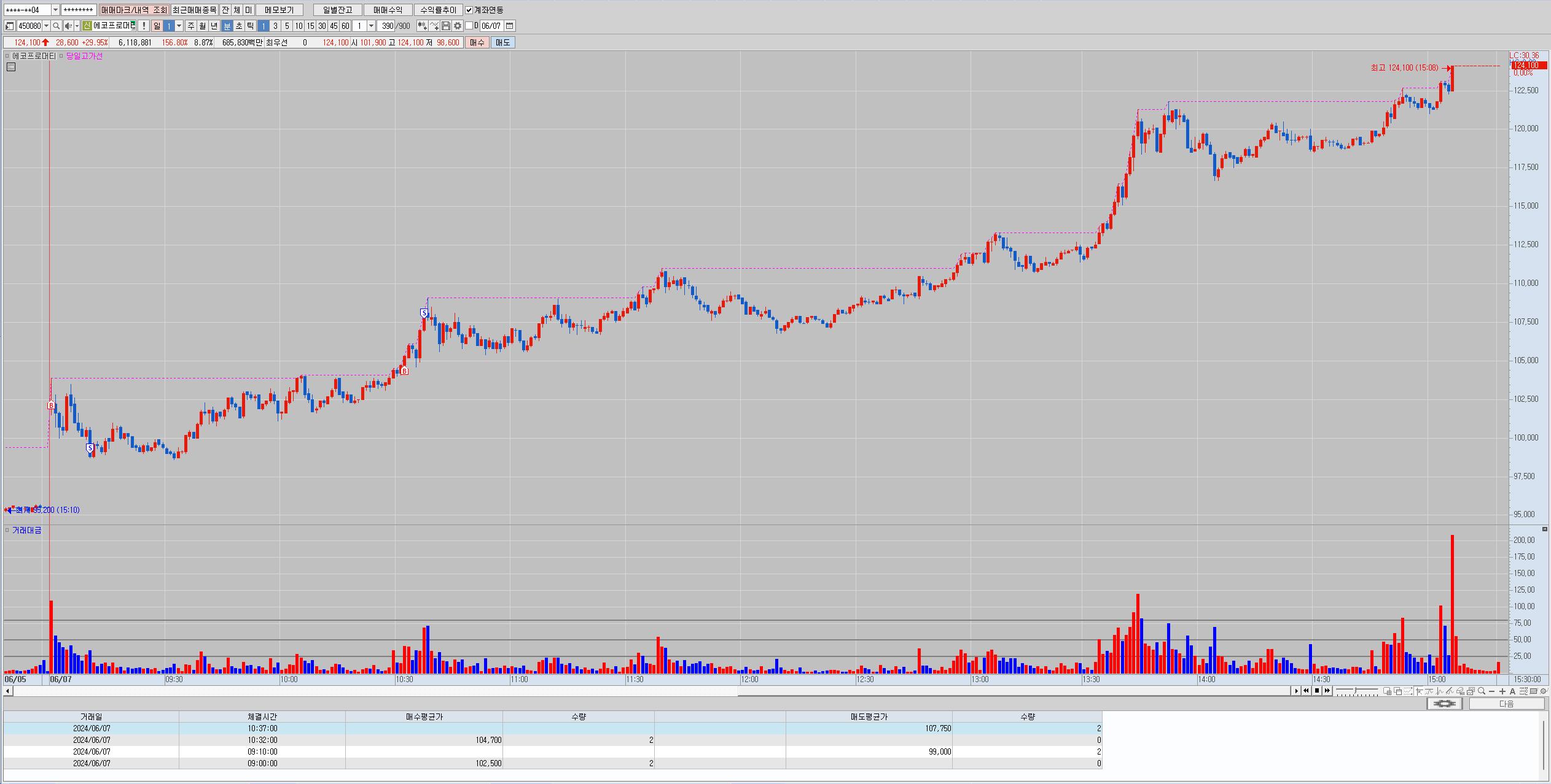 어제부터 오를 것 같아서 매매계획을 짜놓았던 터라 아침 갭이 높게 뜨길래 시초가부터 강할 것 같아서 매수했다