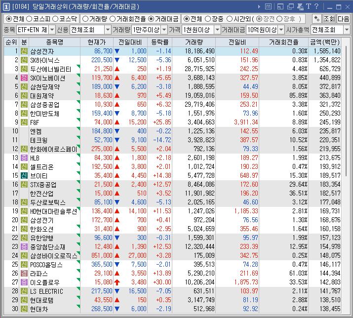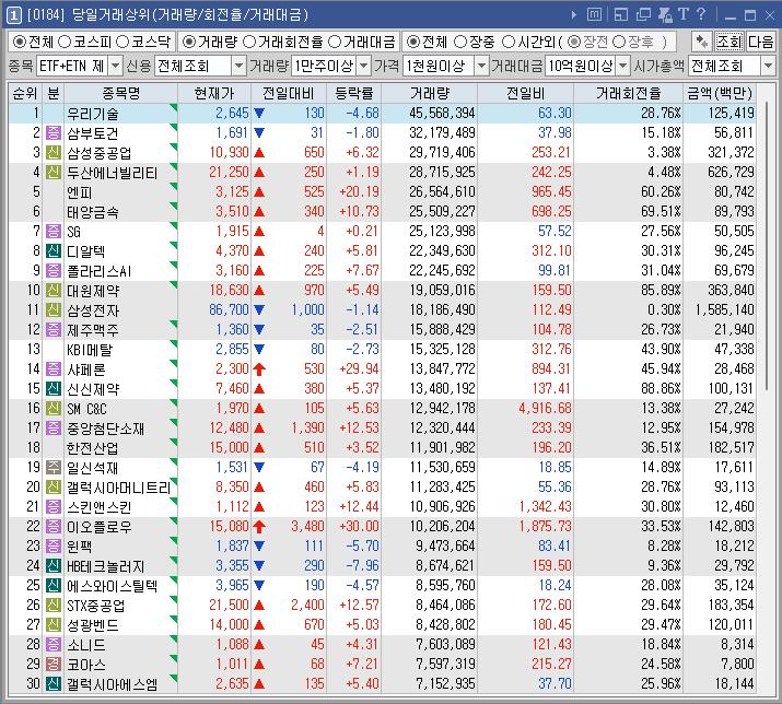 STX중공업 12.57 182,123 조선업 호황과 트럼프 지지율 상승으로 미국의 화석 연료 투자로 LNG선 추가 발주 기대감 속 조선 테마 상승
