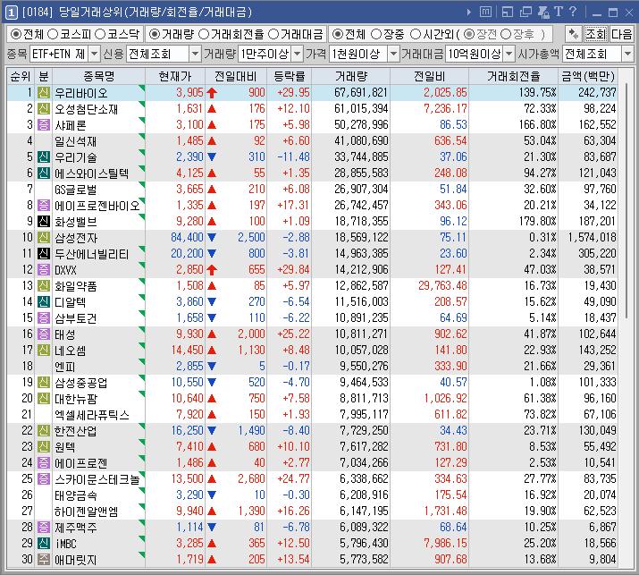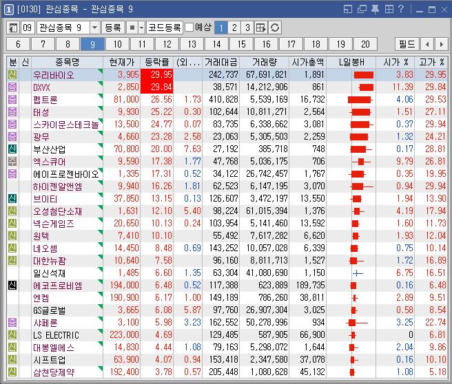 우리바이오 | 29.95 | 242,695 | 바이든 사퇴설에 해리스 부통령 급부상 소식 속 과거 마리화나(대마) 비범죄화 추진 선언 소식 속 마리화나 테마 상승 |