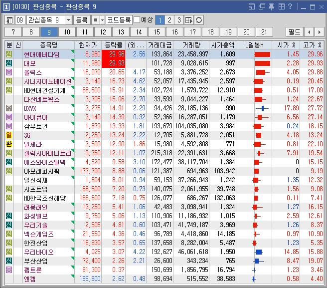 현대에버다임 | 29.96 | 190,327 | 트럼프, 젤렌스키와 통화…"대통령 되면 전쟁 끝낼 것" 소식 속 우크라 재건 테마 상승 |