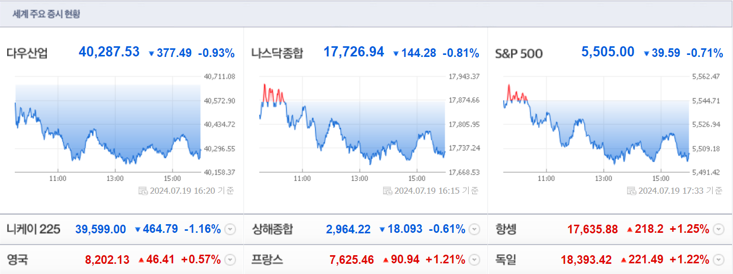 * 바이든 대통령이 후보 사퇴안하겠다고 했다가 사퇴한다고 하는 등 대선 전 정치적 불확실성에 3대 지수 모두 하락