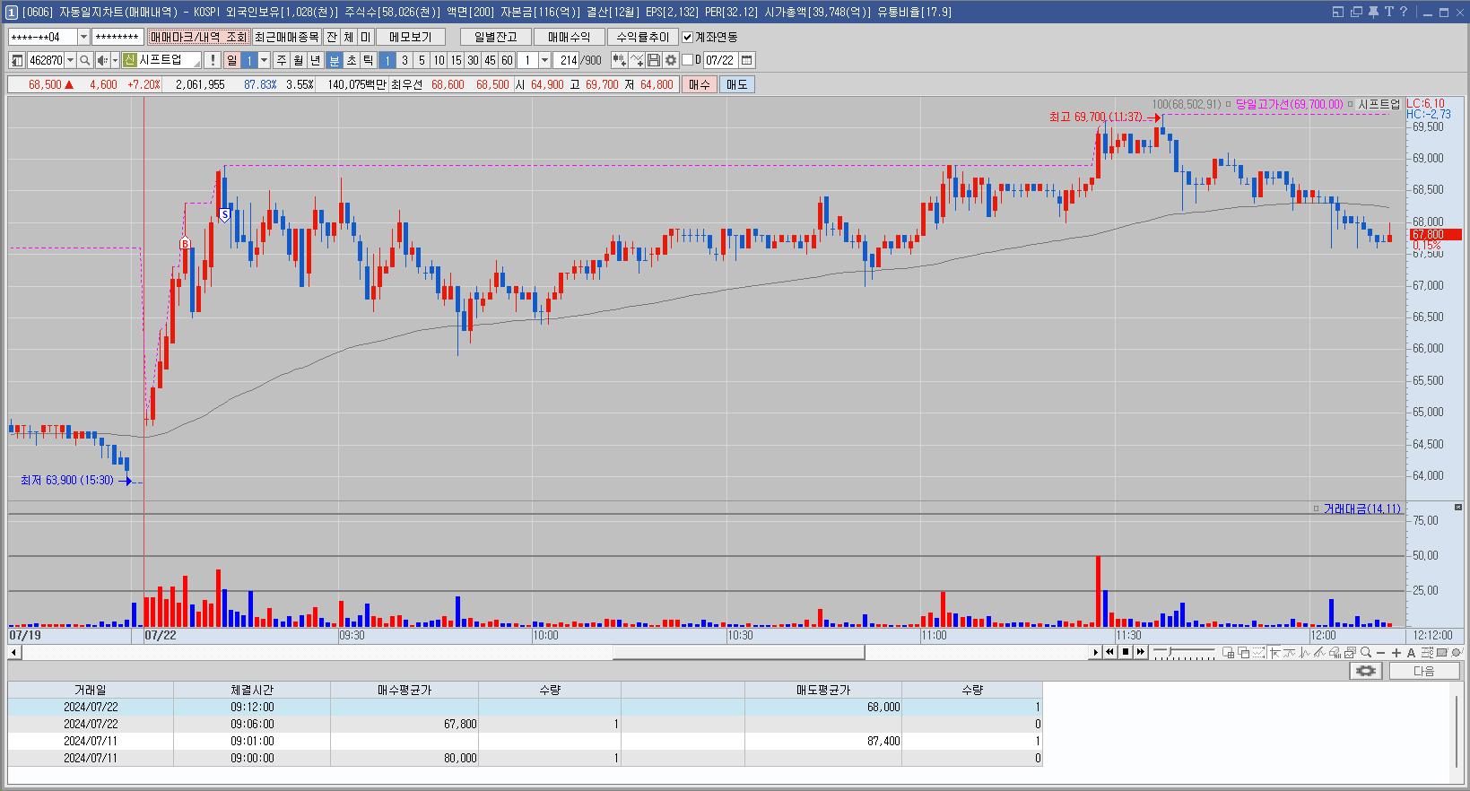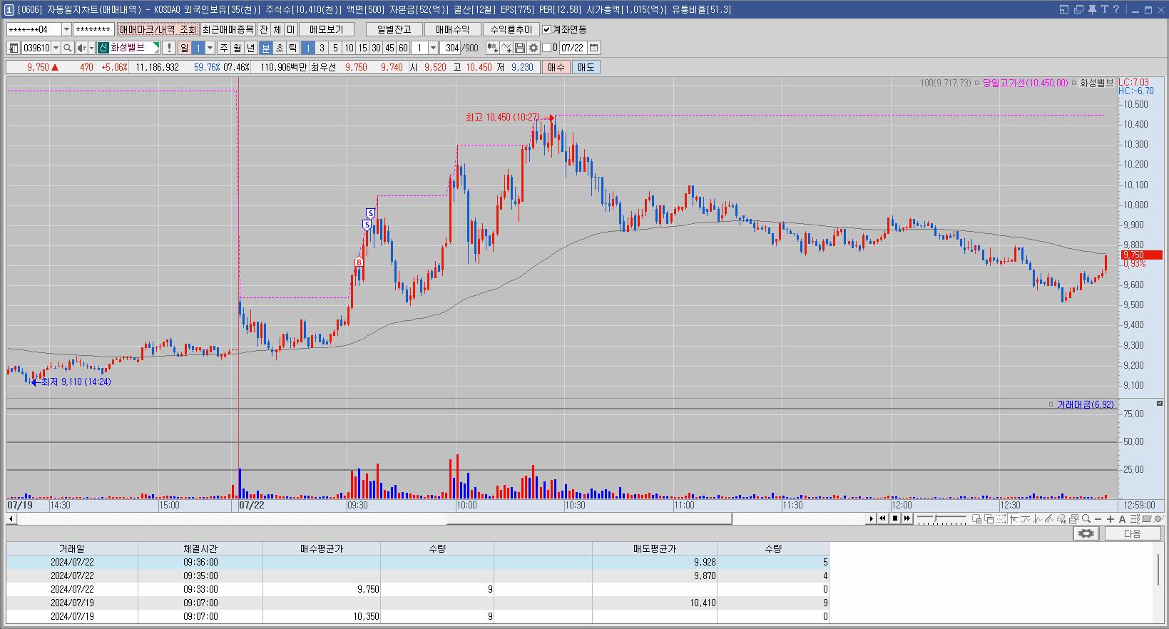 시가를 회복하고 매수세가 붙는 모습에 돌파에 매수. 힘이 줄어드는 모습에 분할 매도.