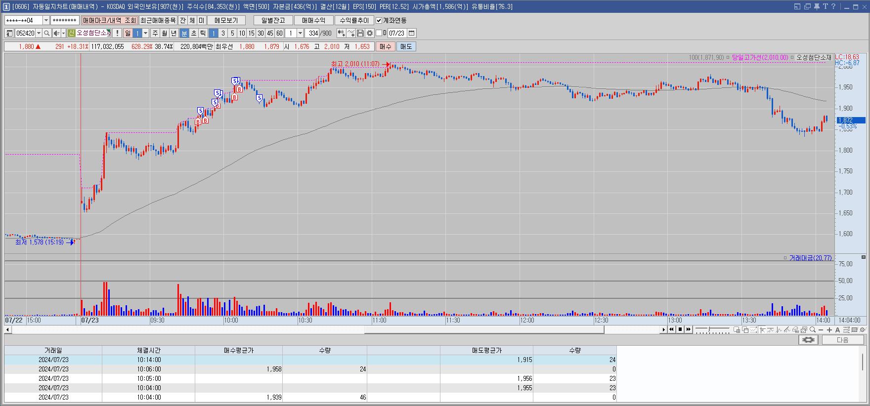 오늘 가격대를 넘어서는가 해서 매수를 했으나 이후 하락을 했다