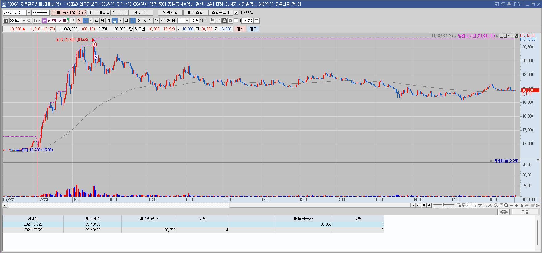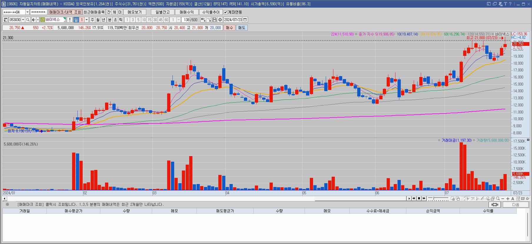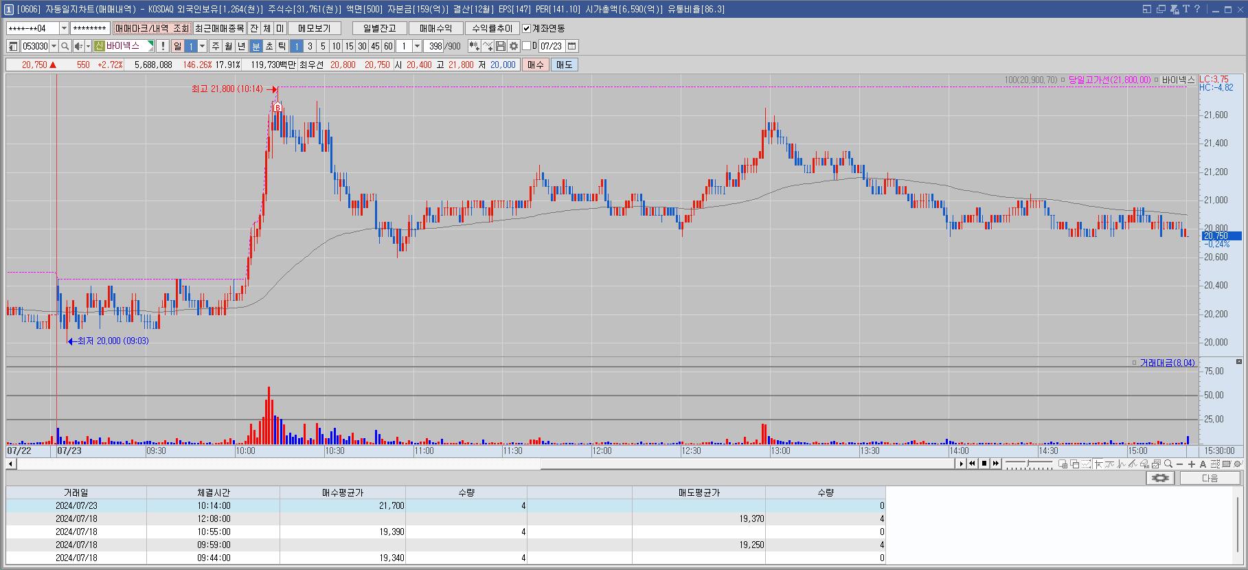 진입이 늦었으면 들어가지 말아야 하는데 엊그제 매매할때 그어놓은 21300원 기준선을 돌파하는 모습에