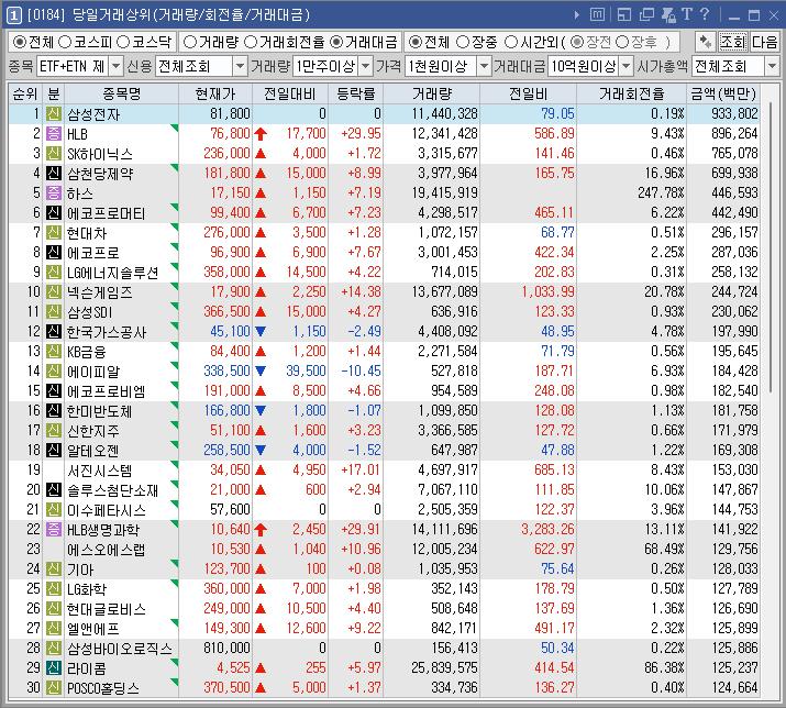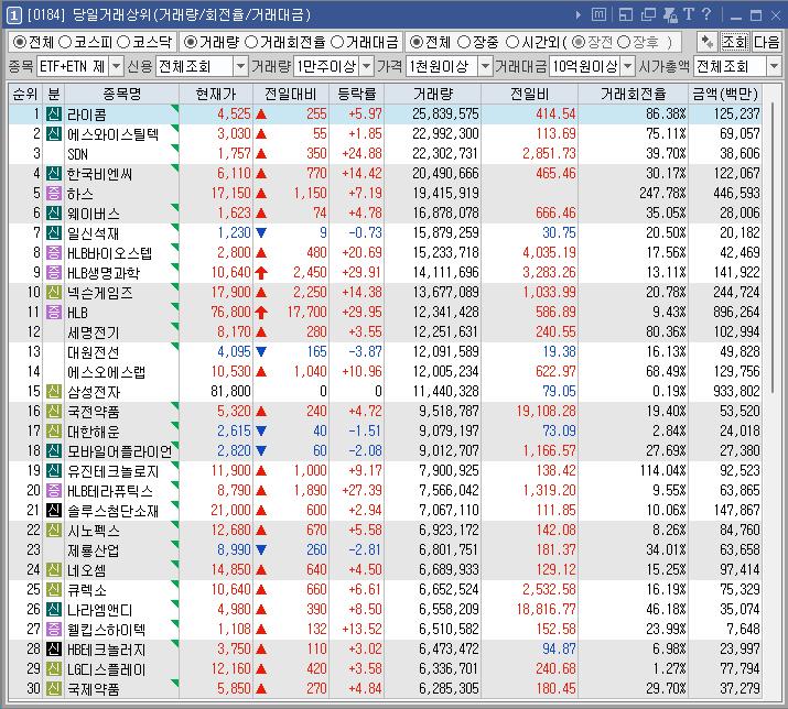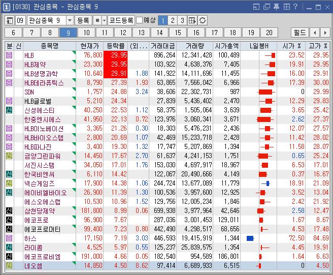 HLB | 29.95 | 895,796 | HLB, 간암 신약의 허가심사 재개를 위한 미국 식품의약국(FDA)과의 미팅 완료 소식 속 HLB그룹주 상승 |