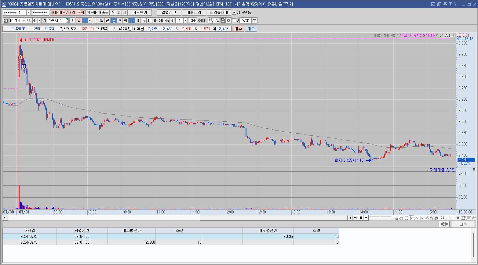장 시작전에 미국장 지수를 보니 하락이라 오늘 국장도 하락할 확률이 높겠구나 싶어서 장전시간외 매도를
