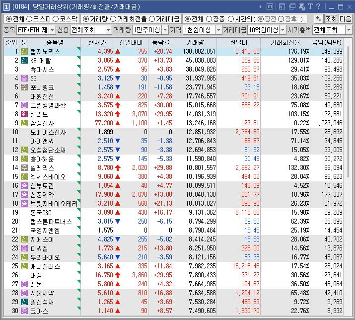케이엠 | 16.32 | 27,447 | “코로나19 재확산에 코로나/마스크 테마 강세 |