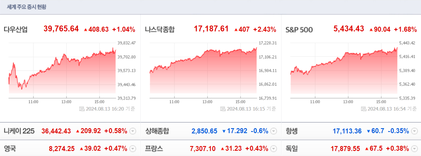 * 7월 PPI 둔화 속 Fed 공격적 금리 인하 기대감에 미장이 큰 폭 상승, 유럽 주요국도 일제히 상승