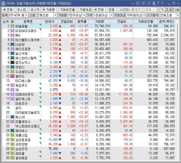 GS글로벌 | 11.47 | 292,719 | ‘대왕고래 프로젝트’ 주관사 입찰 수혜 기대감 |