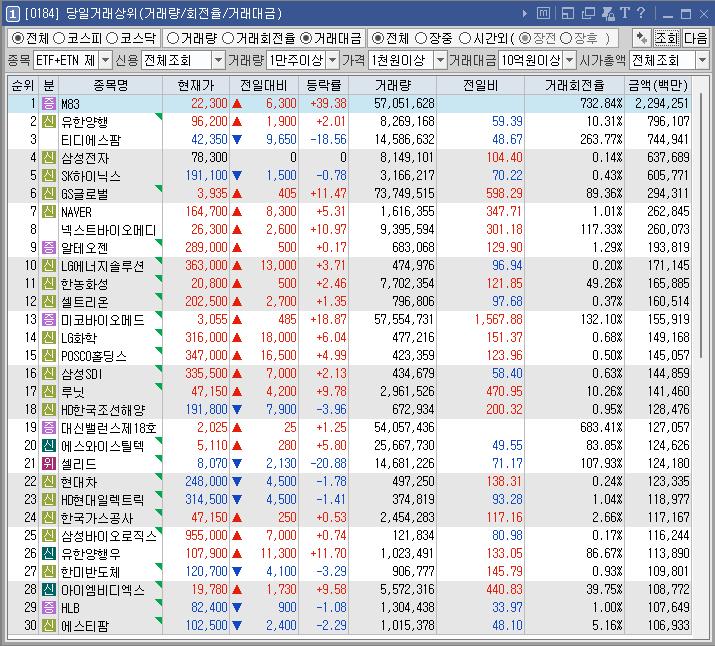 M83 | -6.28 | 10,412 | 투자주의]단일계좌 거래량 상위종목 코스닥 상장 첫날 |