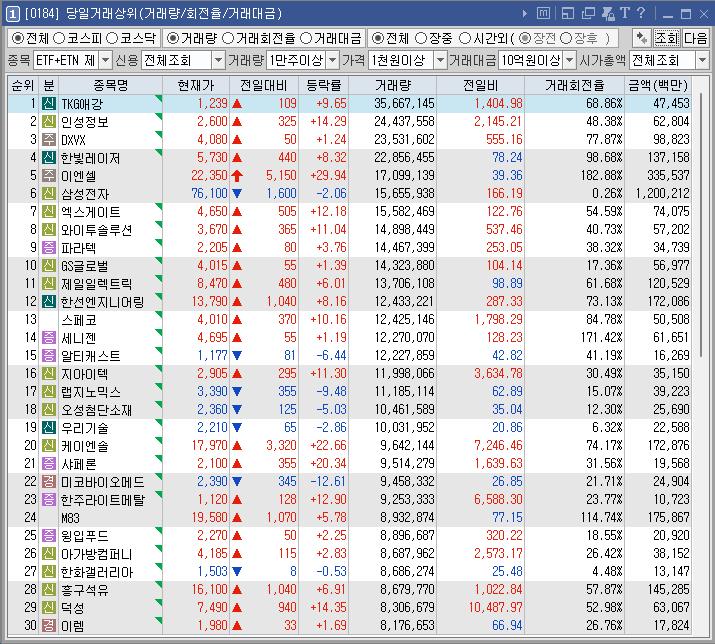 삼성공조 | 21.82 | 98,854 | 엔비디아, 4분기부터 액체냉각 도입 소식 속 액침냉각 테마 상승 |