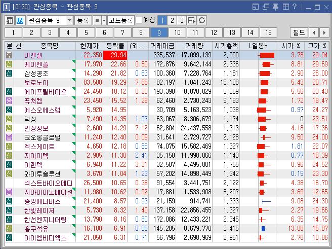 이엔셀 | 29.94 | 335,280 | 차세대 중간엽 줄기세포치료제 ‘세계 최초 개발’ 기대감에 강세 신규상장 2거래일차 |