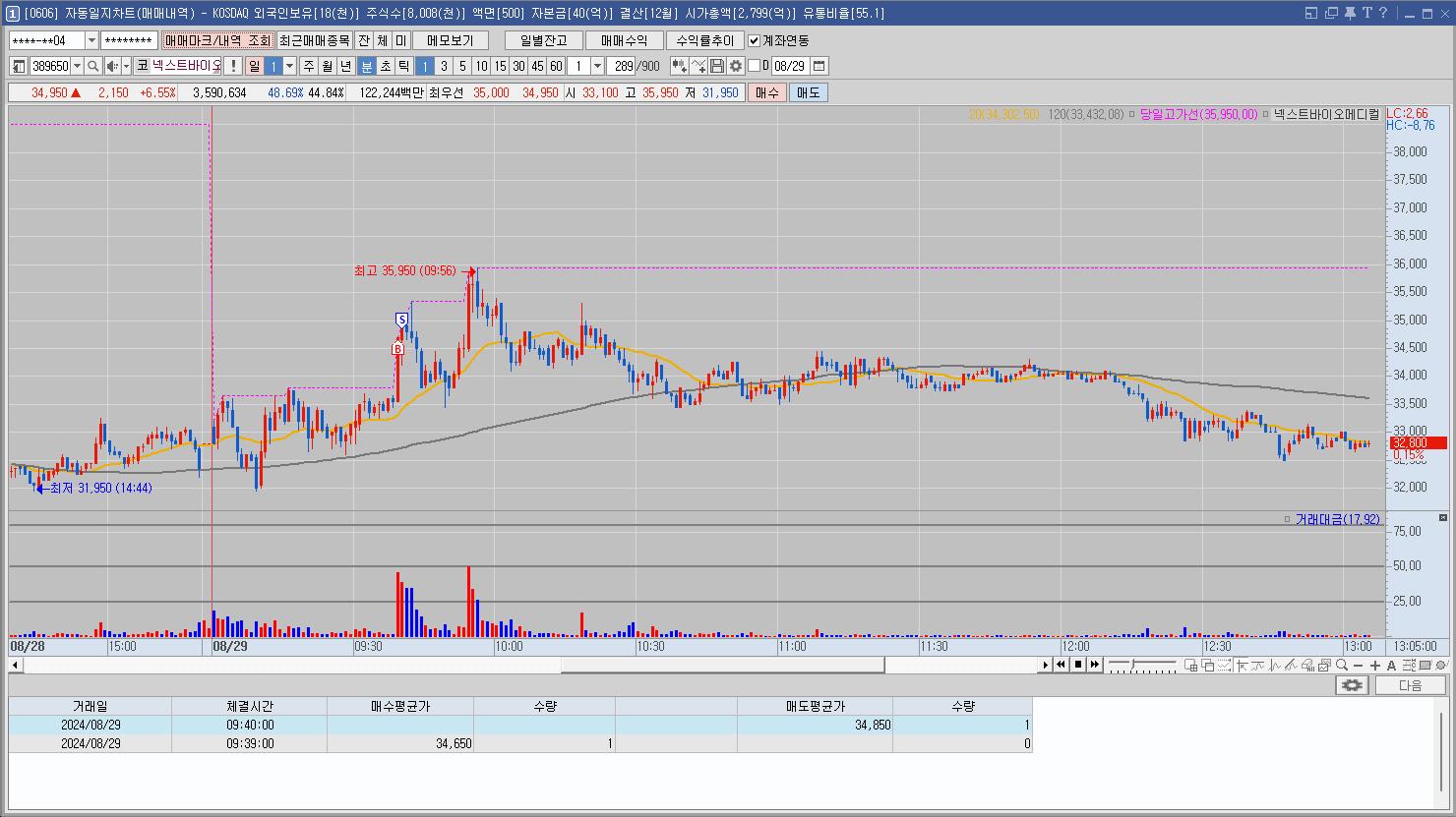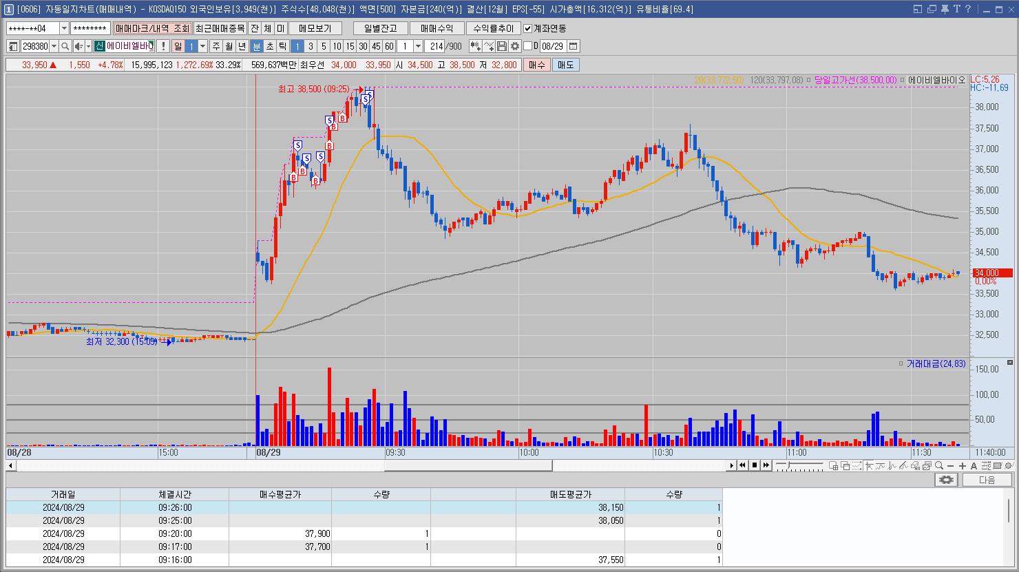 돌파 하는 모습에 매수했으나 매수타점도 늦었고 바이오지만 잘 모르는 종목이라 애매해서 바로 매도했다
