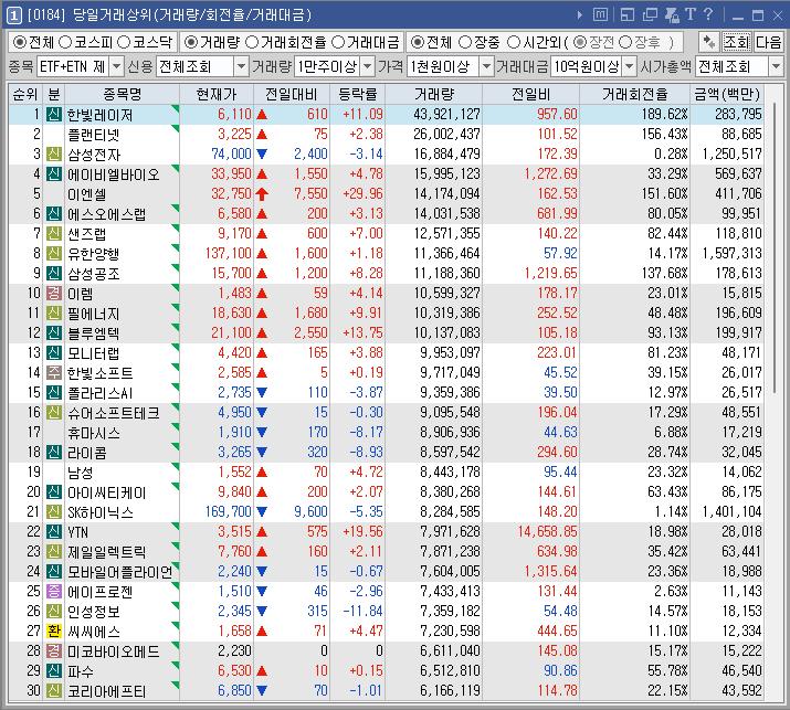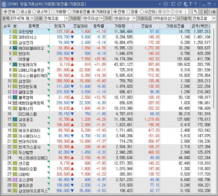 TCC스틸 | 11.22 | 15,359 | 삼성SDI 전고체 배터리 'B샘플' 개발 완료 소식 속 2차전지 테마 강세 |