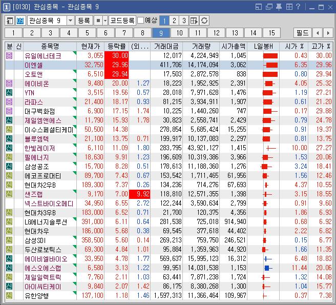 유일에너테크 | 30.00 | 12,014 | 삼성SDI 전고체 배터리 'B샘플' 개발 완료 소식 속 전고체/2차전지 테마 상승 |