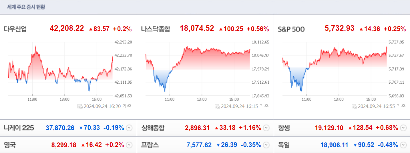 지난밤 미장이 中대규모 경기 부양 기대감, Fed 추가 빅컷 기대감 지속 등에 소폭 상승, 유럽주요국도 상승