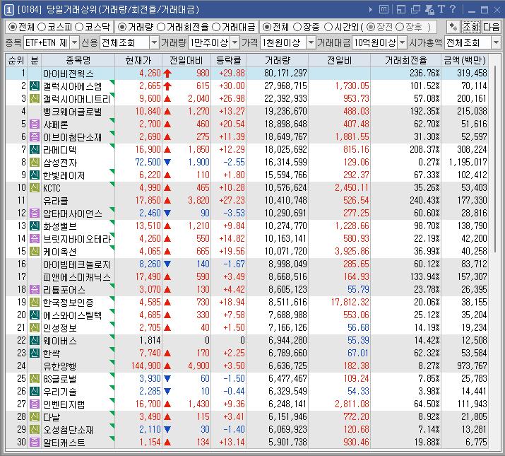 아이비젼웍스 | 29.88 | 319,390 | 스팩합병 첫날 강세 |