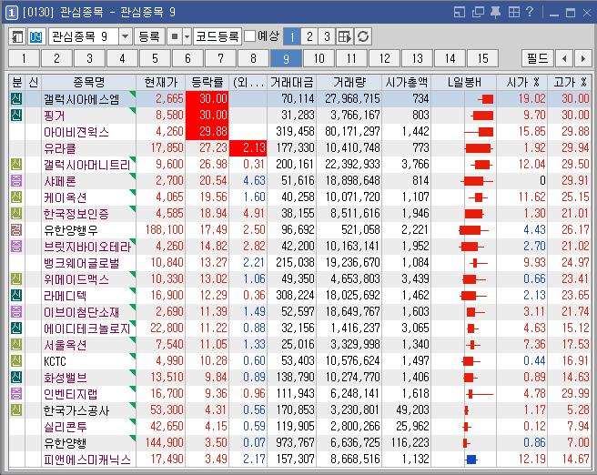 갤럭시아에스엠 | 30.00 | 70,104 | 토큰증권 개정안 내주 재발의 소식 지속 STO테마 상승 |