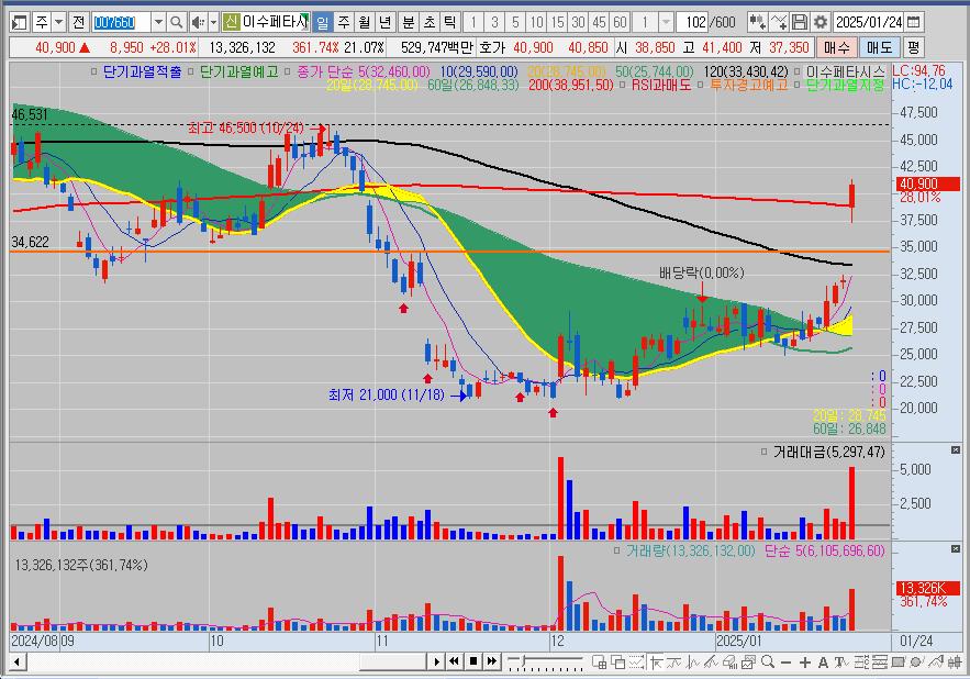이수페타시스 일봉. 호재 + 높게 뜬 시가갭 + 200일선 지지