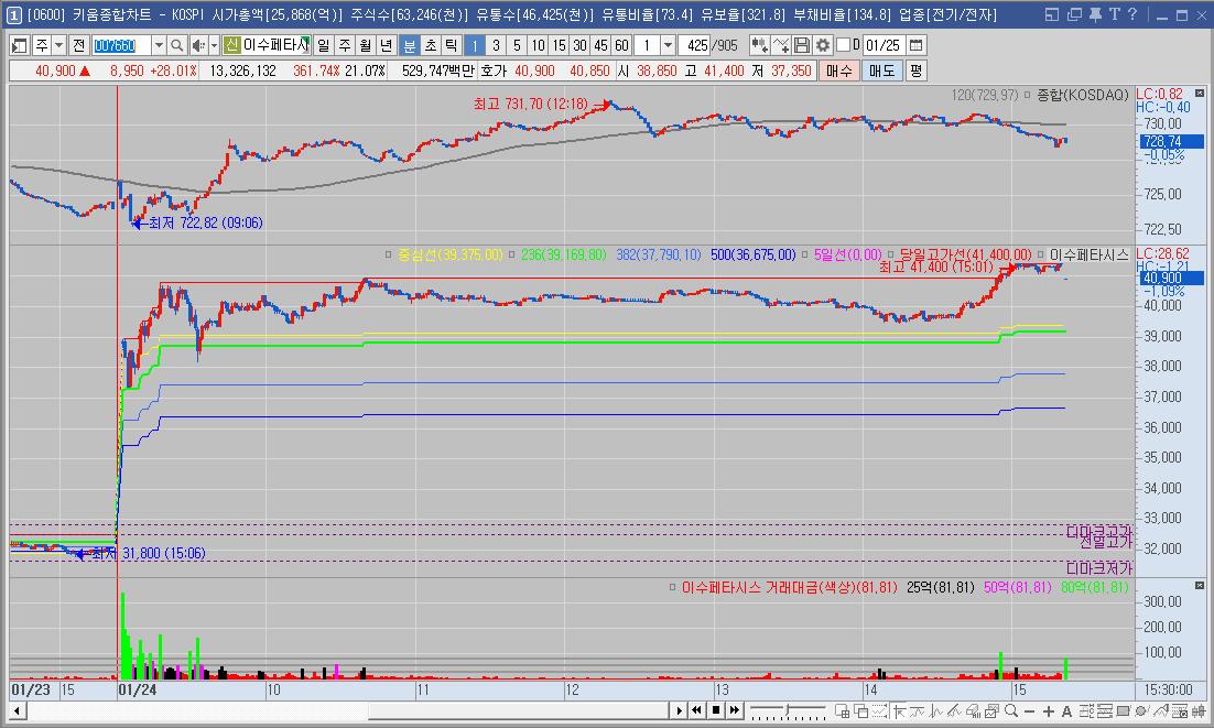 이수페타시스 1분봉. 견조하게 버티면서 강한 흐름