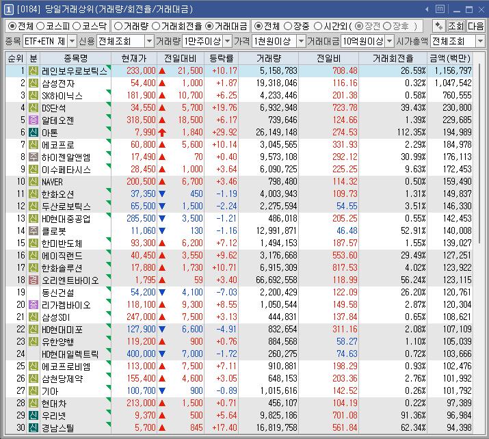 레인보우로보틱스는 거래대금 1조 넘게 터트리며 강세 - 흐름 지속 관찰 대상