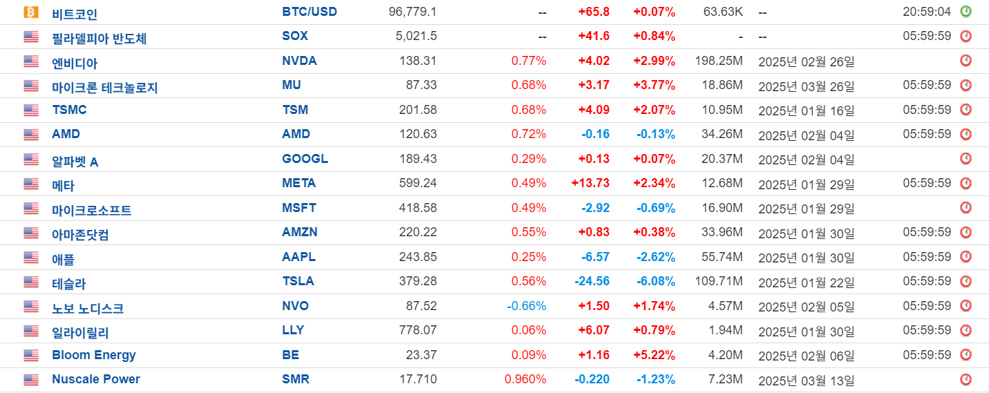 워트 | 9.90 | 24,202 | 엔비디아 3% 급등, 필라델피아 반도체지수 0.83% 상승 소식 속 반도체 테마 강세 |